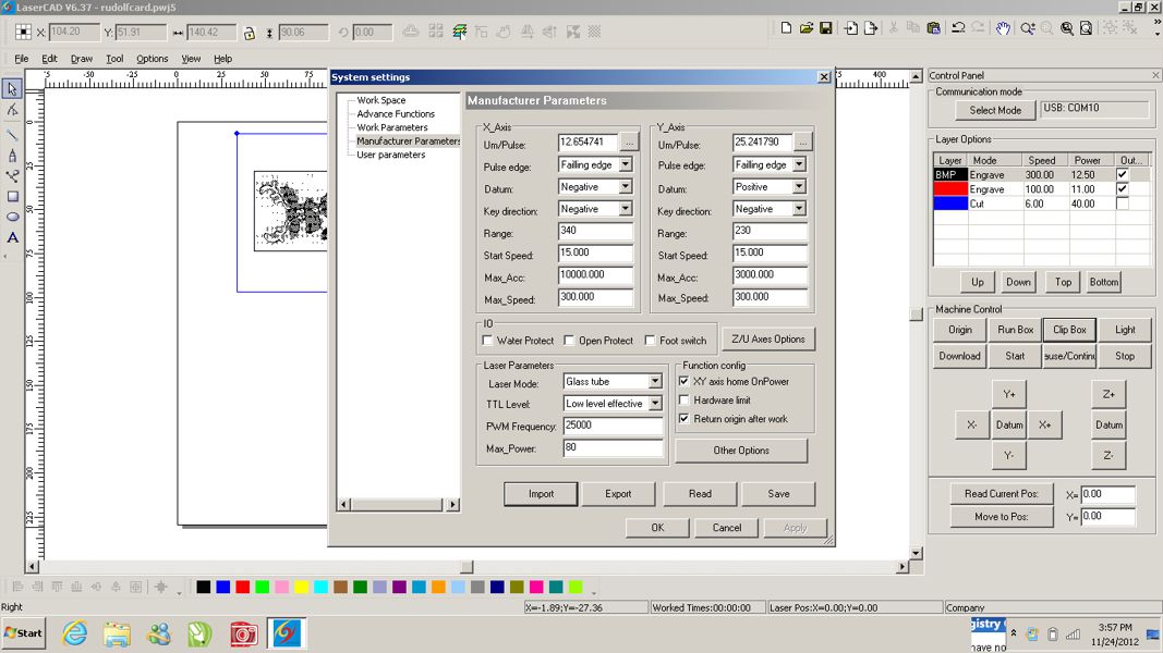 Just install Lasercad 6.27 and have some error like motor strip,