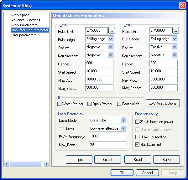 We still have the old problem of having to change the datum direction every time we want to raise the table if we haven't taken it back to where it was before the machine was shut down. I REALLY wish I could disable the soft limits on the Z axis and just be able to drive it up or down without having to keep swapping the origin direction every time it reaches the limits. If you forget to drive the table back to the setting you started with when you first start up the laser then you have to go through that whole set up process every time. I just don't like the whole implementation of it. I don't think this can be changed as it's integral to the whole system. I briefly tried the U axis but I will save that for another rainy day when I get the rest of it sorted out.