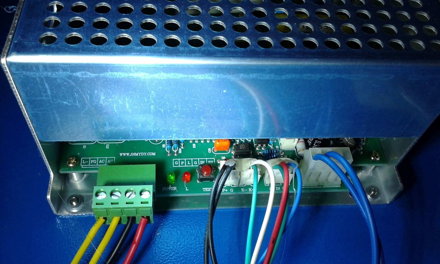 It seams the our brothers across the seas were never consistent with power supplies and color coding. Here is the power supply for the k40 I got. The left connector , the black and red wires go to the power switch, one yellow goes to the analog meter , the other yellow goes to chassis ground. The two black wires go to the laser switch. The next connector has white and green wires. The white one goes to the test switch and one of the green ones go to the test switch, the other green one goes to gnd on the red Moshe board. the connector with the red green and blue wires go to the current reg potentiometer and the right side connector with two blue wires go to the red Moshe board. The amp meter has one yellow wire going to the left connector and a blue wire going to the output end of the laser tube.