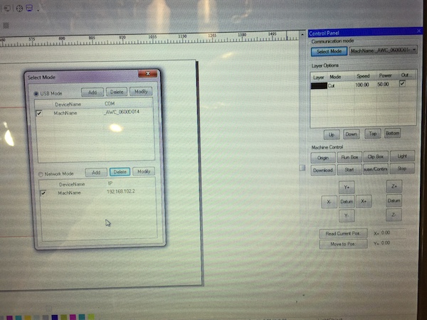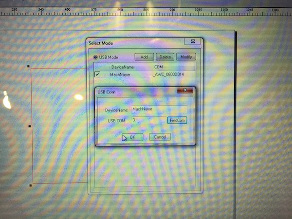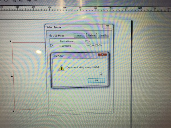 I recently purchased the L0-X7 DSP and loaded LaserCAD V7.86.1 onto my computer (Windows 7). The LCD display WILL NOT connect to the computer under any conditions. I have tried to use the supplied USB cable, as well as a network connection and no matter how I try to connect I always get the "communicating unsuccessful!" error message when trying to use the "Select Mode" button. The "select mode" window always shows COM3, COM13, and COM21 as default options, and can also detect the LCD panel to some extent because it also shows "_AWC_0600D014" as a machine name. However, trying to use the "add" button and the "find com" function always results in the error message. I tried the ethernet connection and despite my computer being on the same network as the LCD panel, it was also resulted in the same error message. I tested the ethernet connection by pinging the LCD panel address. The LCD panel is powered on and is able to move the steppers properly. I tried all the steps with several USB cables, and plugged the USB in the port on the back of the unit, as well as through the splitter cable that came with the unit. I also tried connecting with 2 different computers. I can't help but think this unit is defective.