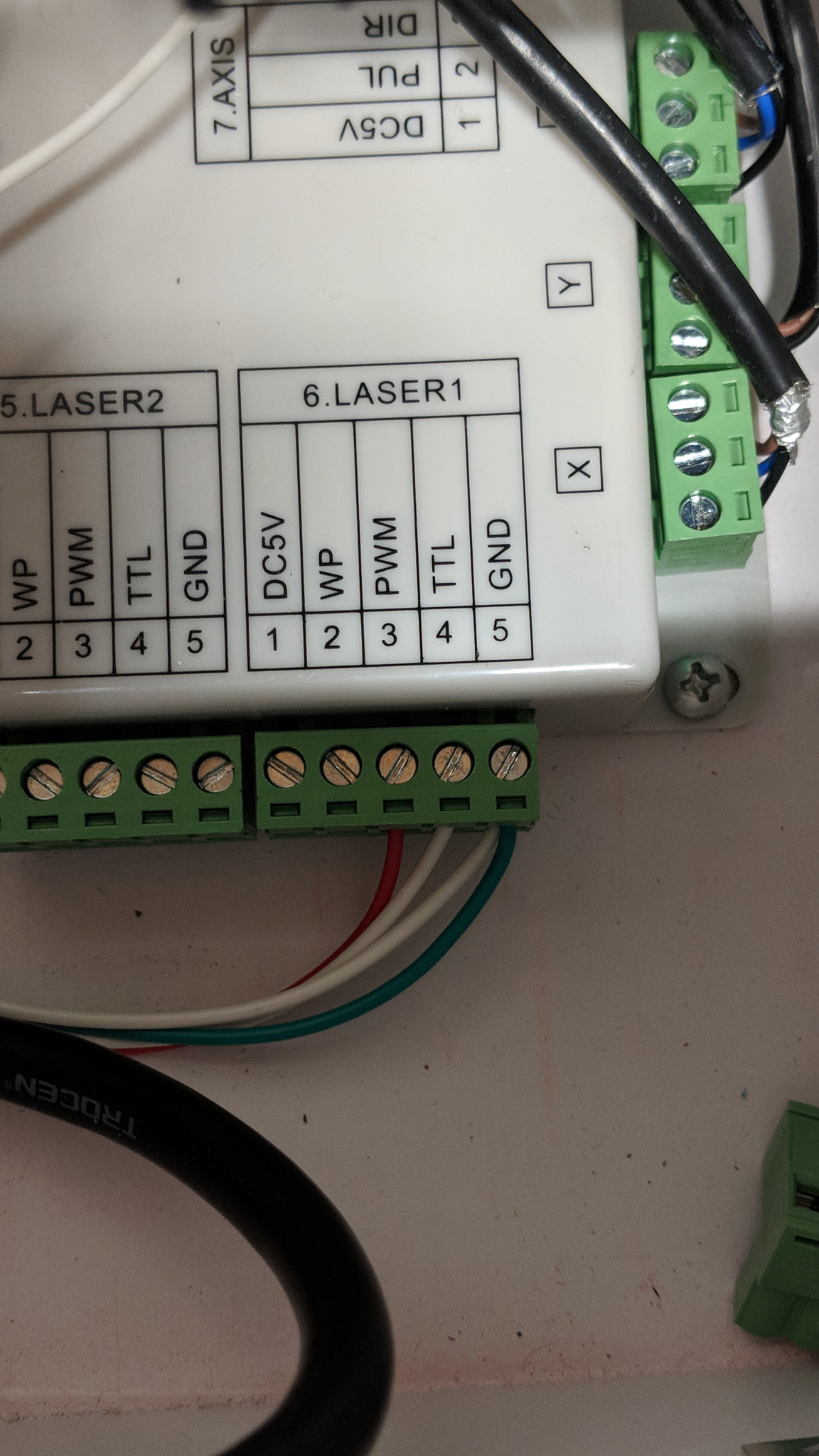 I don't have this issue but I'm having a heck of a time figuring out the exact wiring for my X7 to the k40 power source. I have the power brick that was posted above so it doesn't line up exactly with the diagram that was posted by LO on the other section of this forum. If I try to test fire the laser with the controller it won't work. It won't work if I use the test button on the power source either. I can only get a test fire to work if I unplug the Phoenix connector from the X7 and then use the test button on the power source.