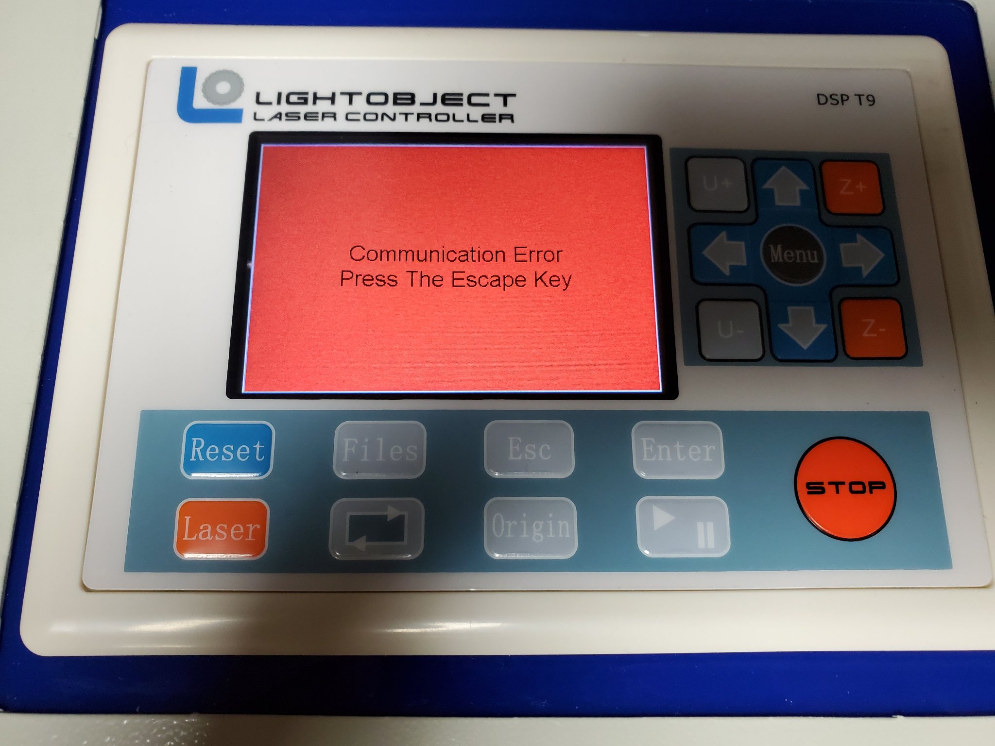 Bought t9 upgrade for my k40 in Nov 2017. Had family matters to deal with. I just did the upgrades over the last few weeks and all was looking good. The x and y axis homed correctly and the z axis moved fine.I went to run the test square and only the x axis moved,the y axis didn't. I was able to control everything from the computer and the dsp screen without any problems.The next day booted everything up and the same thing happened. I was looking up what to check and when I went back to lasersoft program everything was in Chinese. I uninstalled and then reinstalled laser soft but it wouldn't connect to the machine and the machine screen was red and said "communication error". I tried to reinstall lasersoft several times but keep getting the error. Tried 2different usb cables without any extension,Ethernet cable and the Wi-Fi module without any luck. I can't even move anything from the dsp screen. Is there anything else that I can try? I saw the other post and tried disconnecting the display and all other connections with no luck.