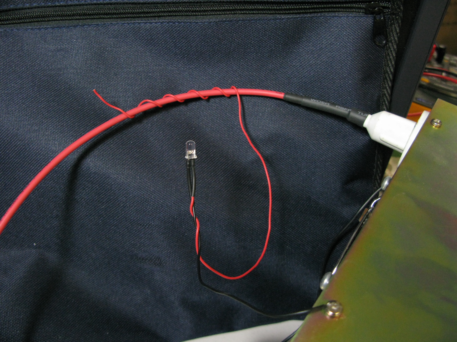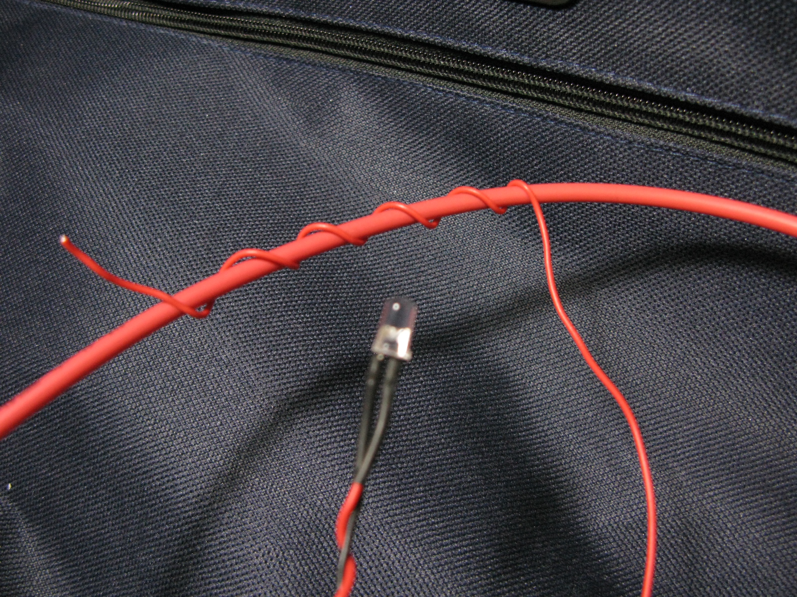Once you press a "Test" button (if any), or you fire the laser, the LED should light up. The LED I used is a regular 1.5V and I coiled up the wire about 5 rounds with LED poitive leg to the HV cable and the negative leg connecting to the case (ground). Note that the LED light up brigher if coils are stretch out than tighten up.