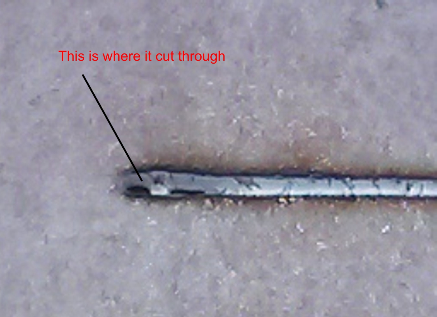 The close up shows just the first part of the cut. The black in the cut is where it cut through.