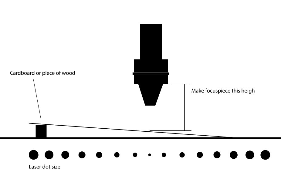 Put a piece of cardboard or wood on the bed with a pencil or something similar under one end. Fire the laser for a similar time over the length of th paper. As the distance from the lens to the object changes the dot size changes. When you find the smallest dot size, measure the length from the object to your reference point and make a focus block this length. Usually you want the focus block a fraction smaller (0,5 mm) than what you measure.