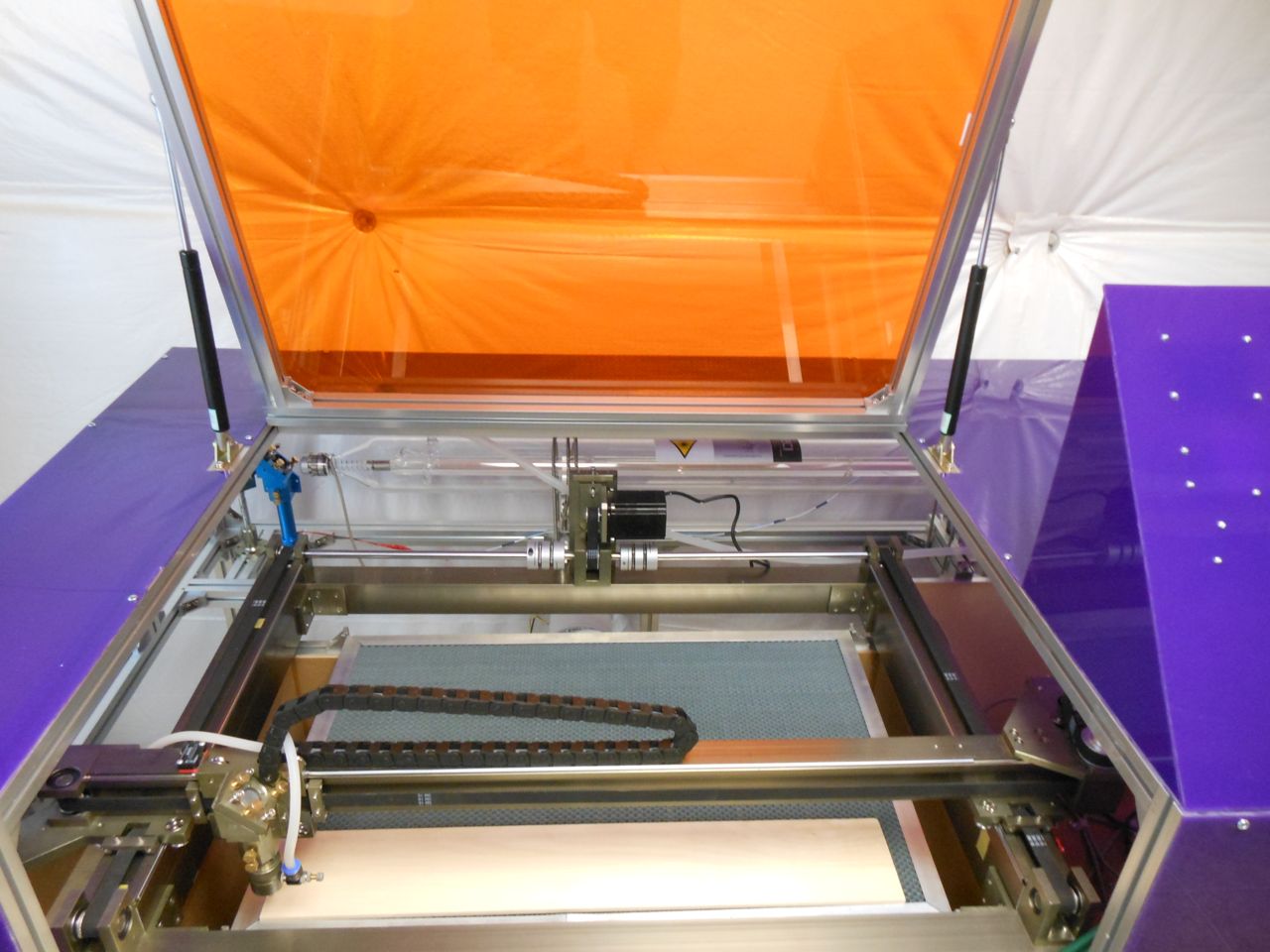 I'm finishing up my 400 x 600 80 watt laser and have been cutting out panels of acrylic I purchased at ePlastics.com. I chose an orange clear acrylic for the door cover and a solid or opaque purple for the rest of the machine. However, I still wear safety glasses while the laser is cutting. Even with the glasses which I purchased from Marco and the orange clear acrylic, the light from the laser is pretty bright.