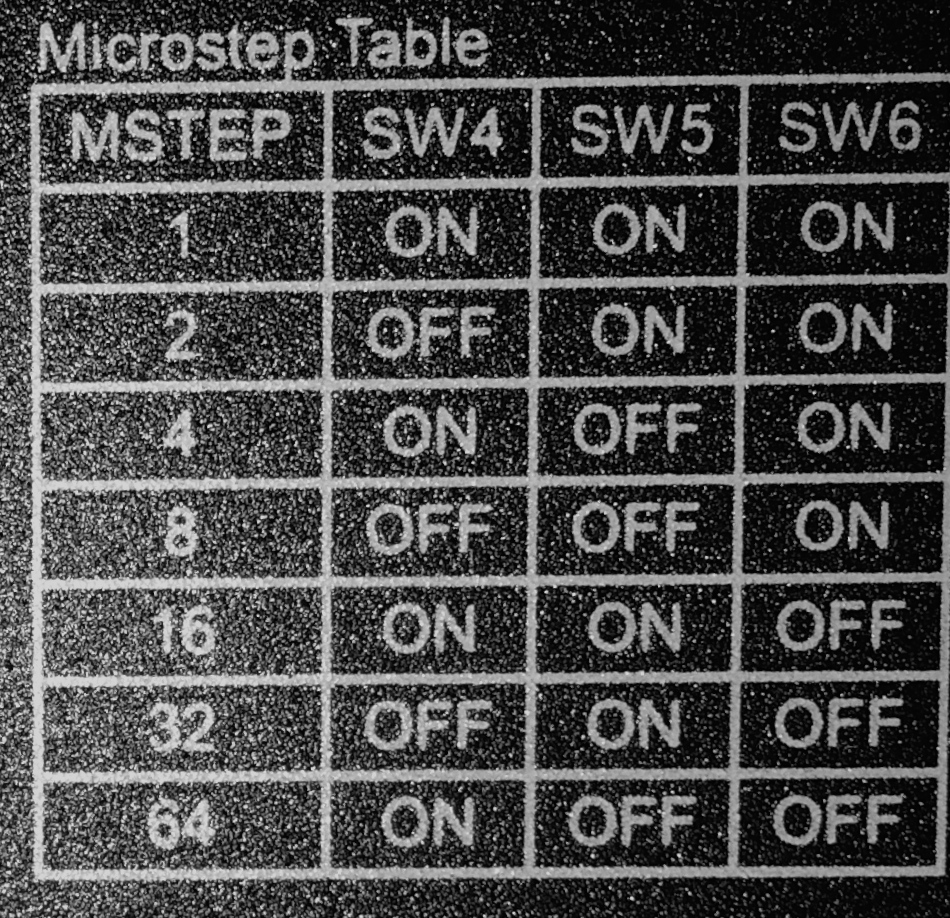 The stepper drivers are M415B from Lightobject, the relevant DIP switches and table are shown in the attached pictures.