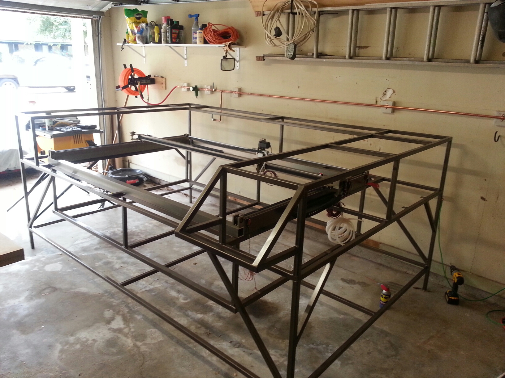 I received the frame on Sunday, and after 3 cans of brake cleaner, a roll of blue shop towels and 7 cans of Rustoleum paint, I got it painted and in my garage before the rain and the Superbowl started. I think it turned out really well. I'm still planning out the wiring, but I have both cable chains installed with the air assist cable, all 4 limit switches and the X-axis stepper wired up. Next step is to attach the gantry and start mounting the electronics. The overall size of the table is 110" long by 72" deep. Also, if you look at the bottom right hand corner of the frame, you can see I mounted a grounding cable to the frame. I ran a 8' grounding rod into the ground right outside the garage, and ran a 6 gauge copper wire through the wall and mounted it to the frame. I should have a really good ground now for everything.