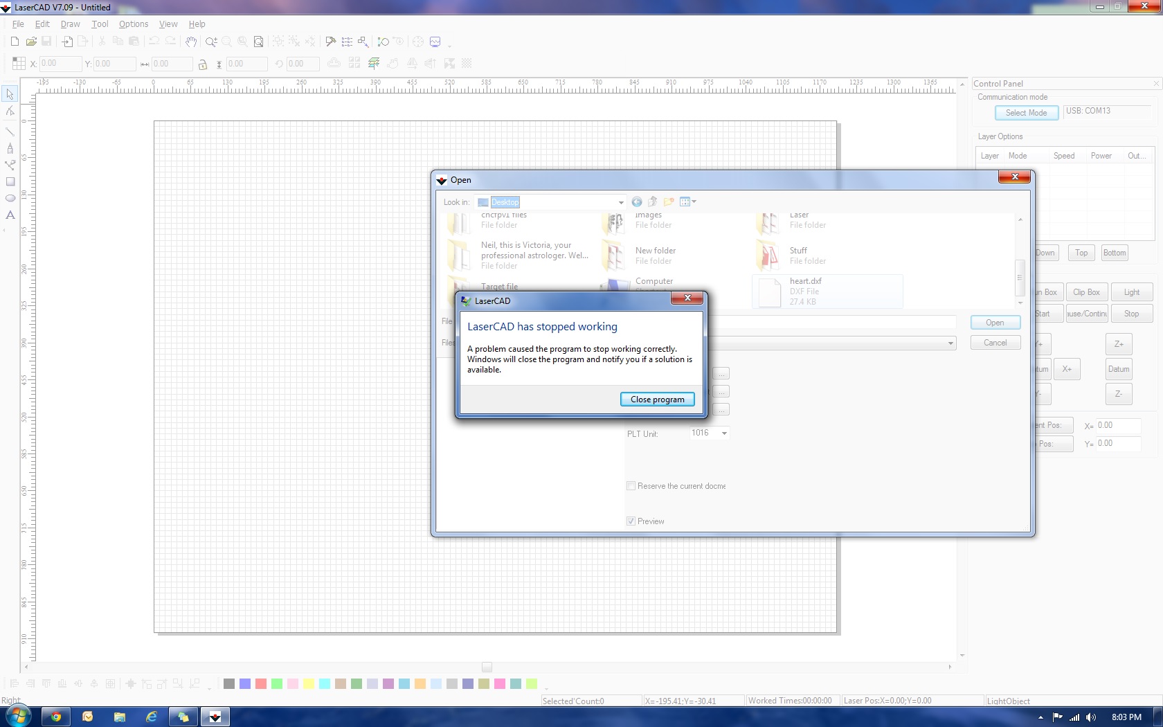 Most things import just fine, but some artwork causes LaserCAD to crash immediately on preview. And some dxf files appear blank.