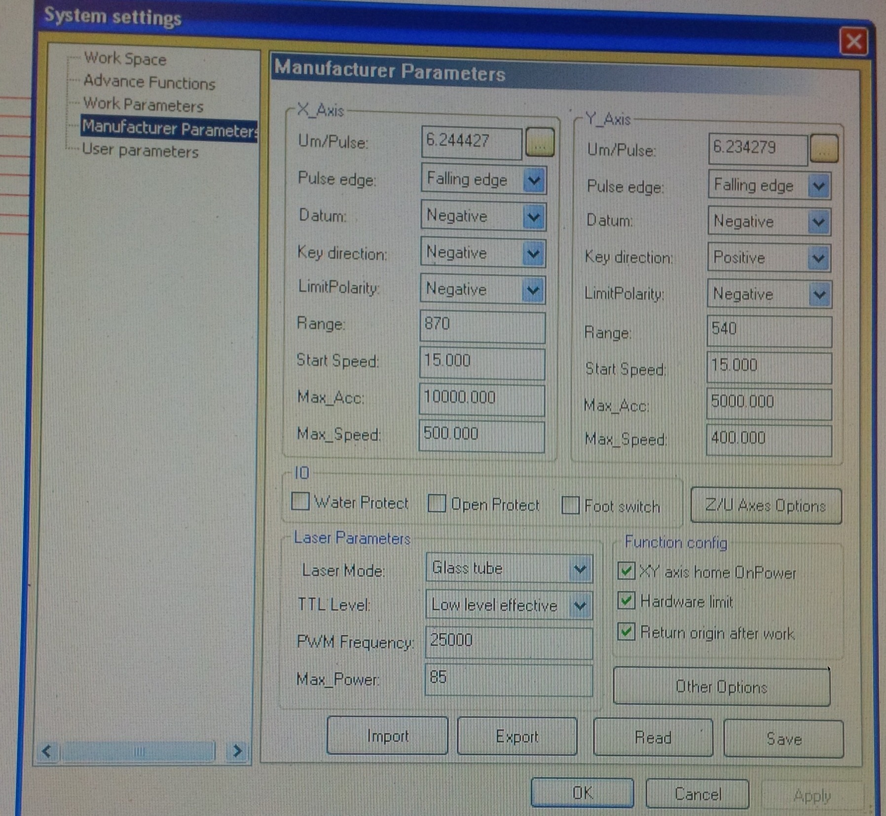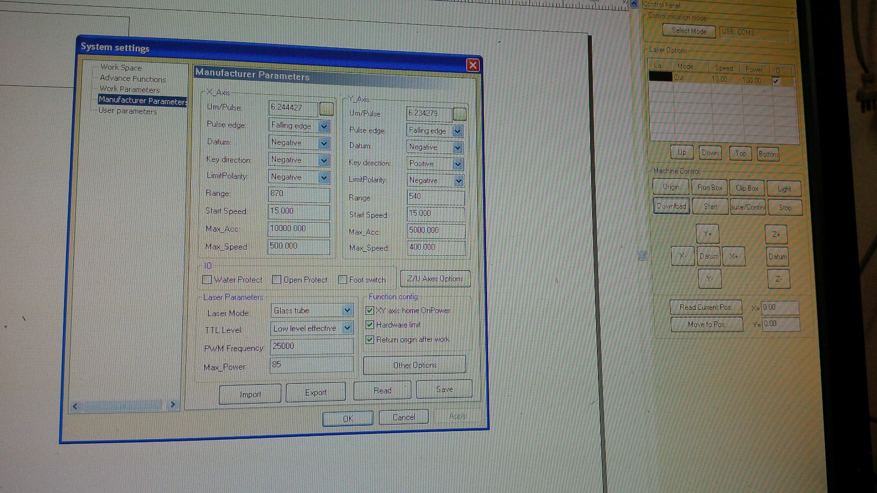 Can you send a screenshot of the 'manufacturer settings' in lasercad? And what wiring schema did you choose (especially between the DSP and laser PSU) ?