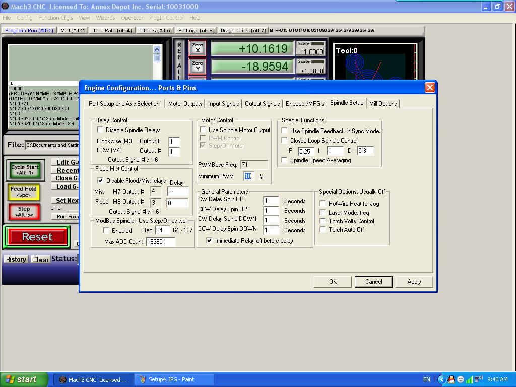On Mach3, the most confusing part is the Enable Low or Enable High. It really mess things up easily. Again, do test and try to understand it. When I tried PWM controlling on Mach3, I spend 4~5 nights just by trying each 'check box' on Mach3.