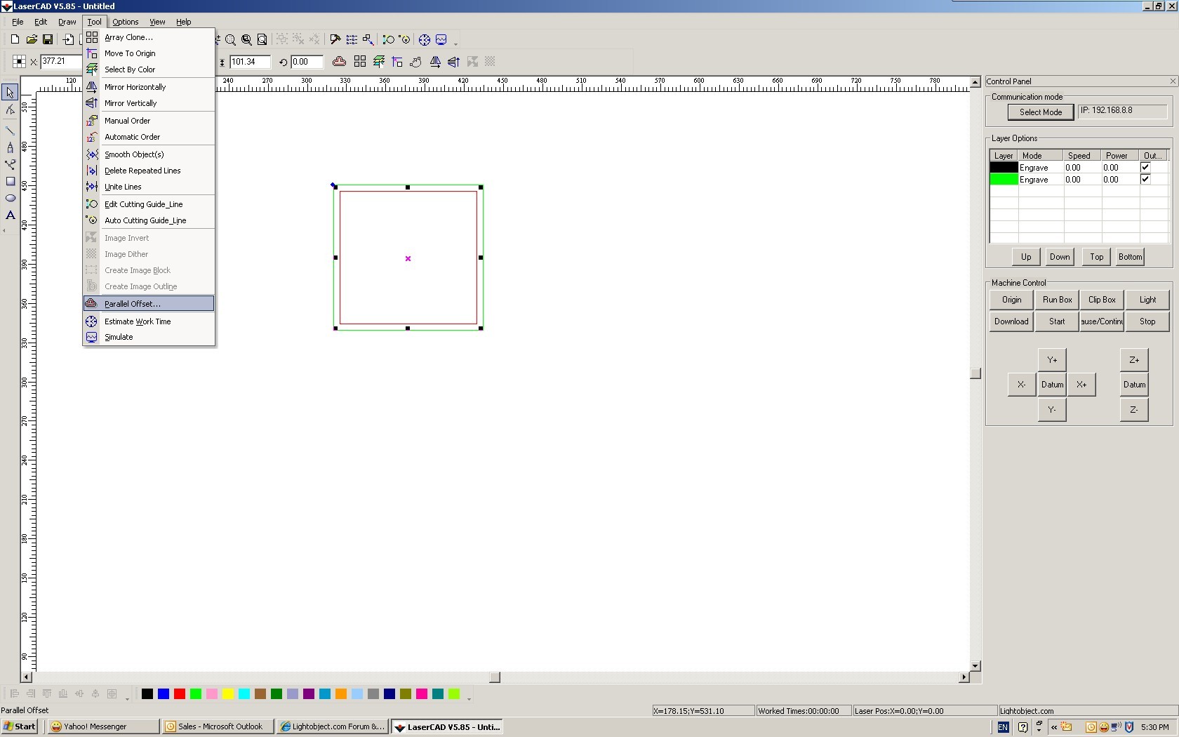 Taking the 100mm x 100m square cut as an example. If the machine follow exact route from the drawing, ideally it will cut 100mm x 100mm. But since the laser is doing "melting', so, it will end up a square of 99.5mm x 99.5mm (note, it's just my assumption for that amount). So, let's now set the "Parallel offet" by 0.5mm Outer. It will do 100.5mm x 100.5mm cuting. After minus the burned off, you will get 100mmx 100mm perfect square! Isn't it a good features!
