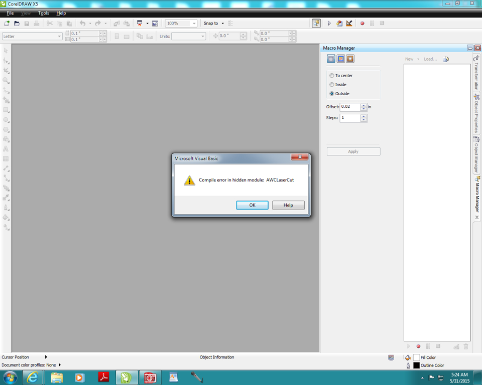 but if I open the CorelDraw x5 the message comes up " compile error in hidden module AWClasercut"