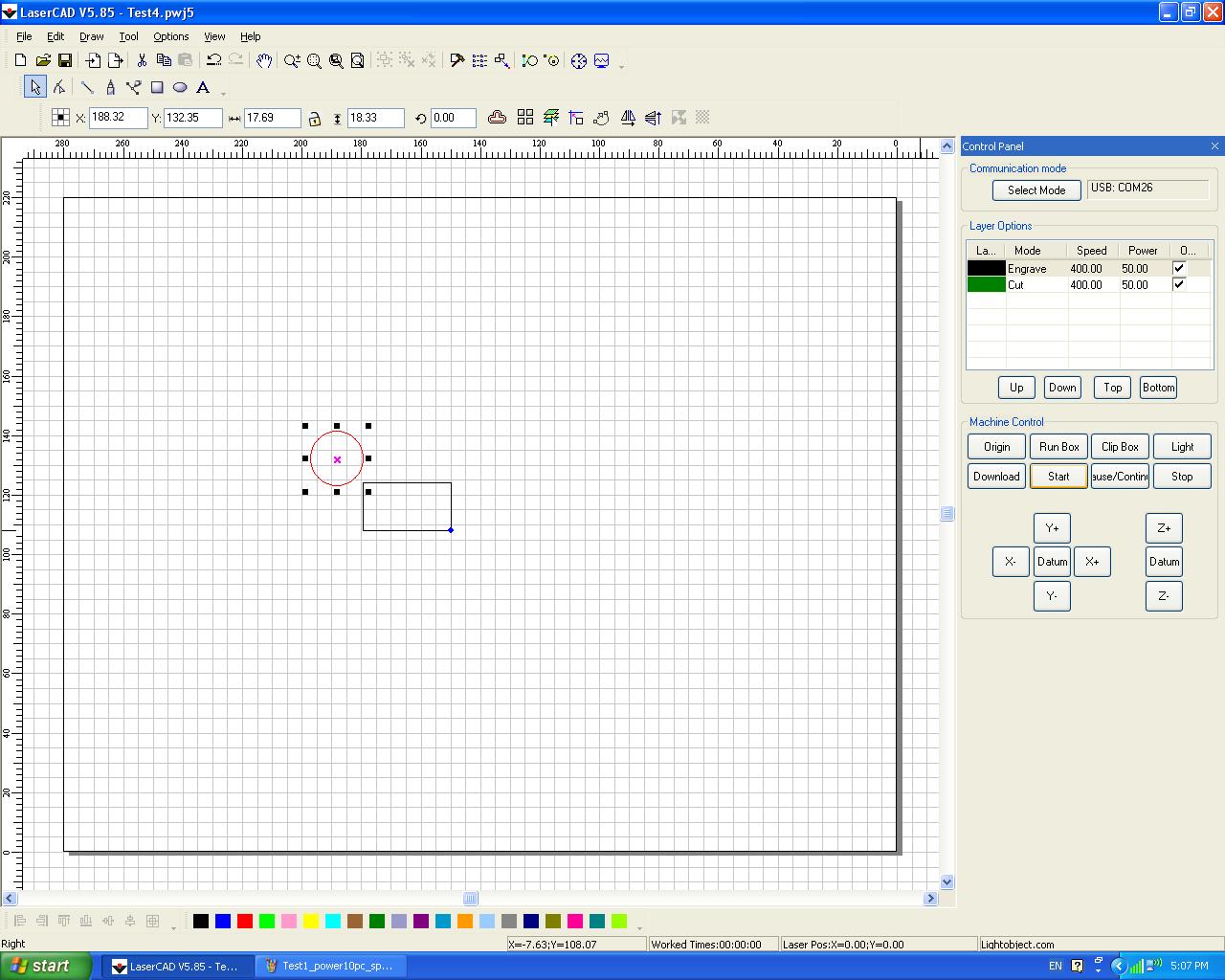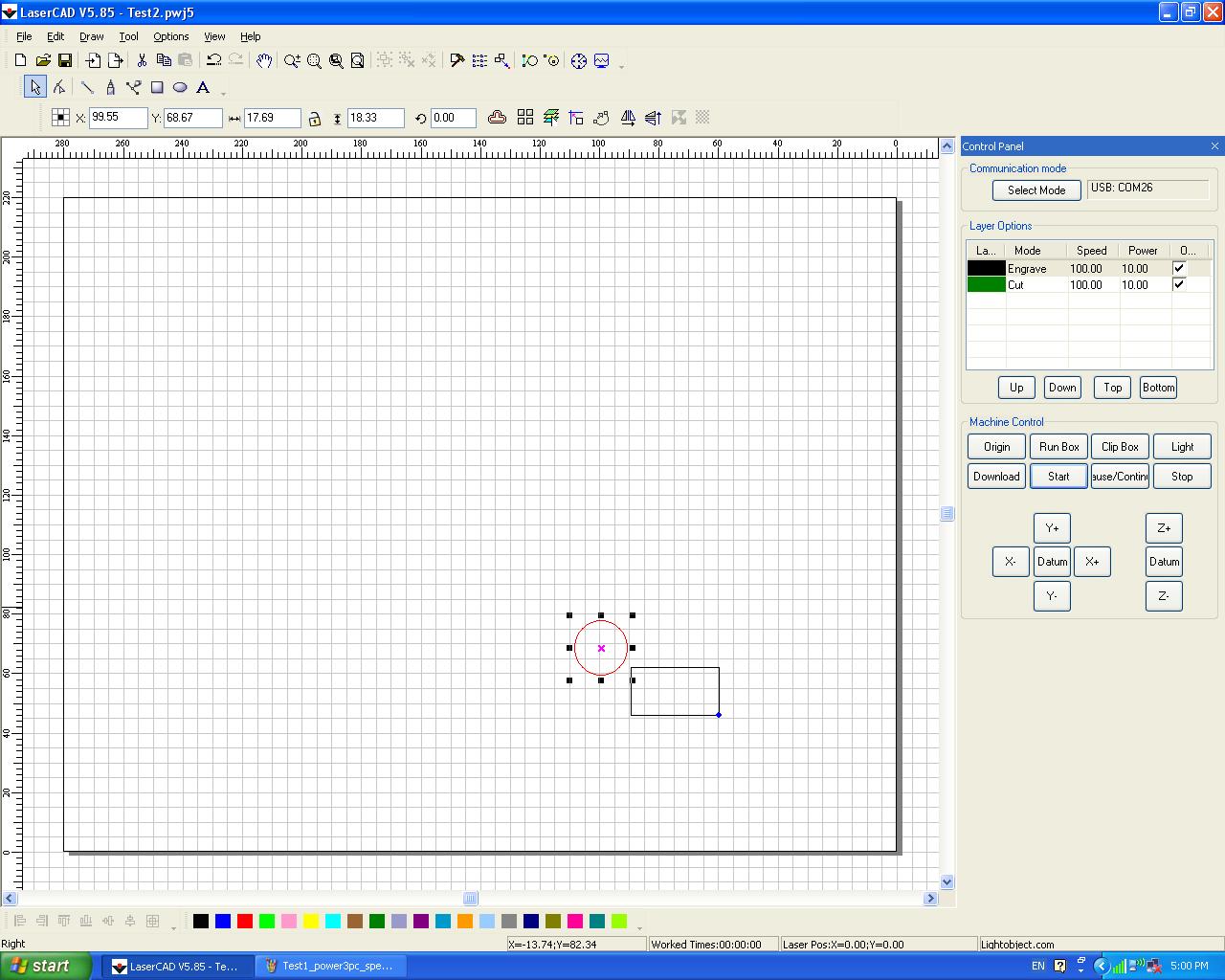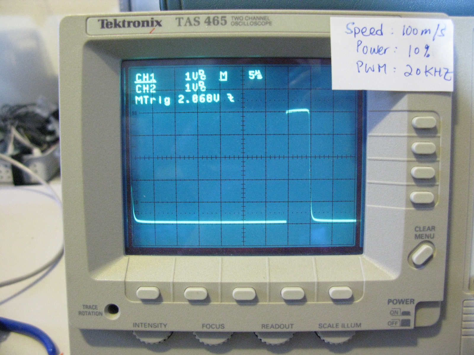 I created a simple file with different the power/speed. I named it Test1,2,3,4 and save it to the Mainboard. Then, I copied all four files to a memory stick. Format the main board and read files from the momory stick on by one. Then, I have a test probe attached to the PWM vs Ground. From the scope waveform, you can see that the period of the pulse didn't change. The only change was the pulse width, the longer pulse with higher power %. When power setting set to 50%, it output a Square pulse 50/50.