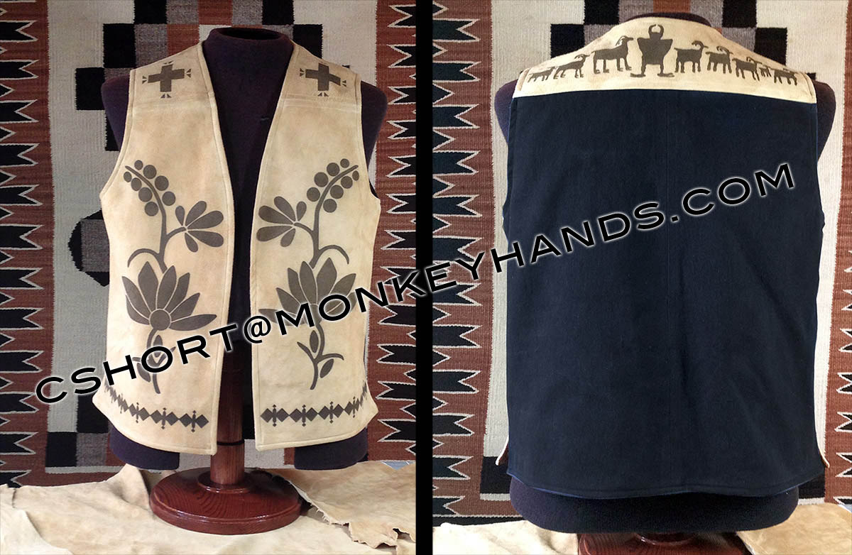 i did the design work based on my tribal heritage (citizen potowatomi nation) and used my laser cutter to etch it into leather pieces. my mother, who is an excellent seamstress, turned the etched leather into a vest.