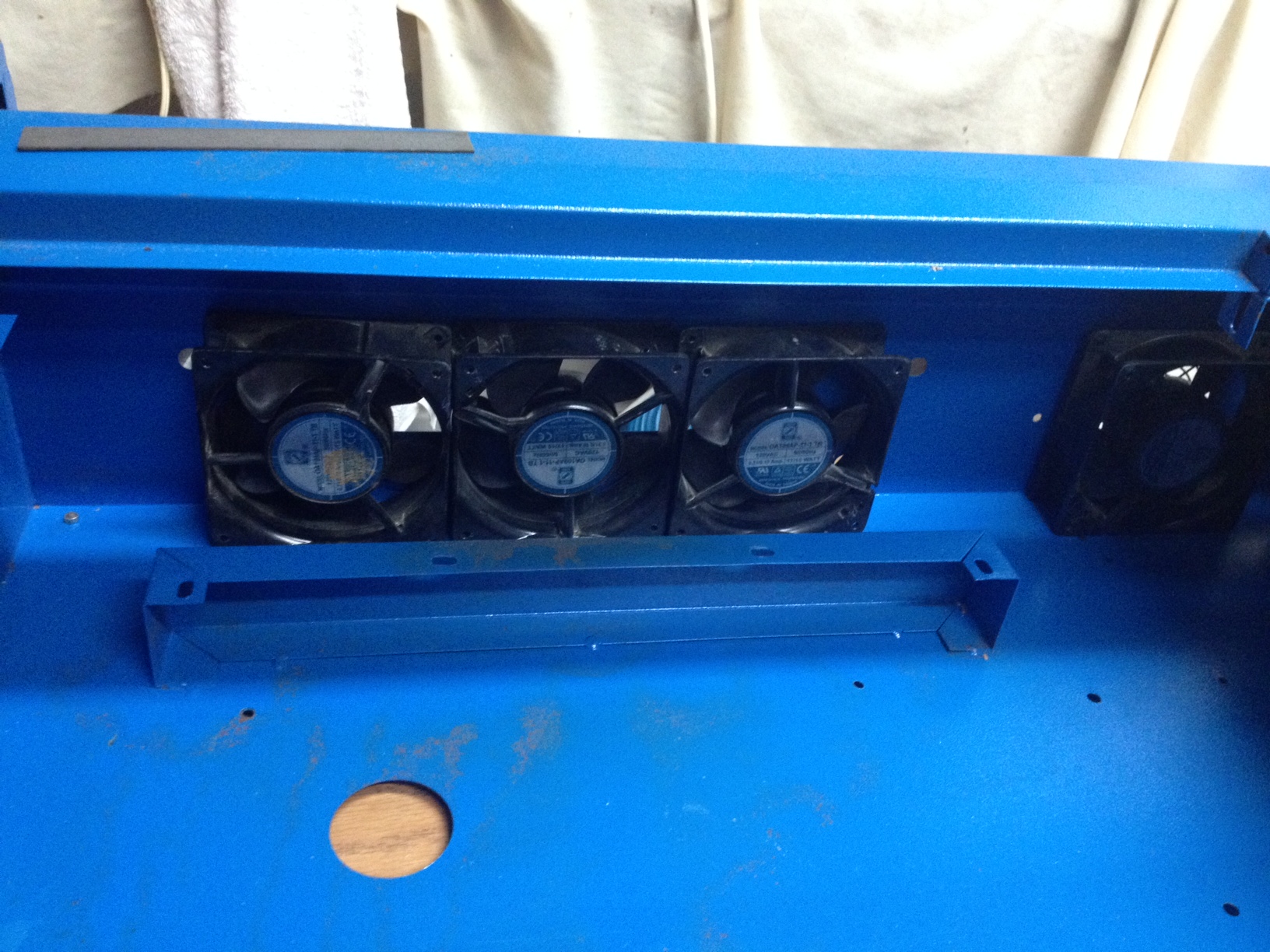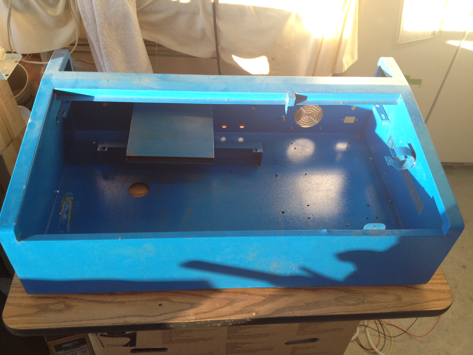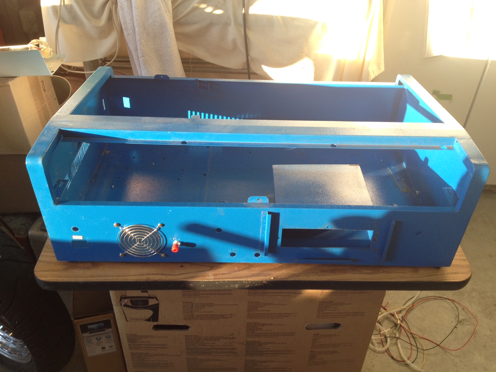 The gantry (moving arm that carries the #2 mirror and the lens holder/mirror) is inside the cabinet, and at this point basically slid back as far as the gantry track will allow. There's plenty of play there -- I could move the gantry forward about 1/3 the stage's travel if needed to get the x-y stage in -- so I know it's not the gantry that's in the way.