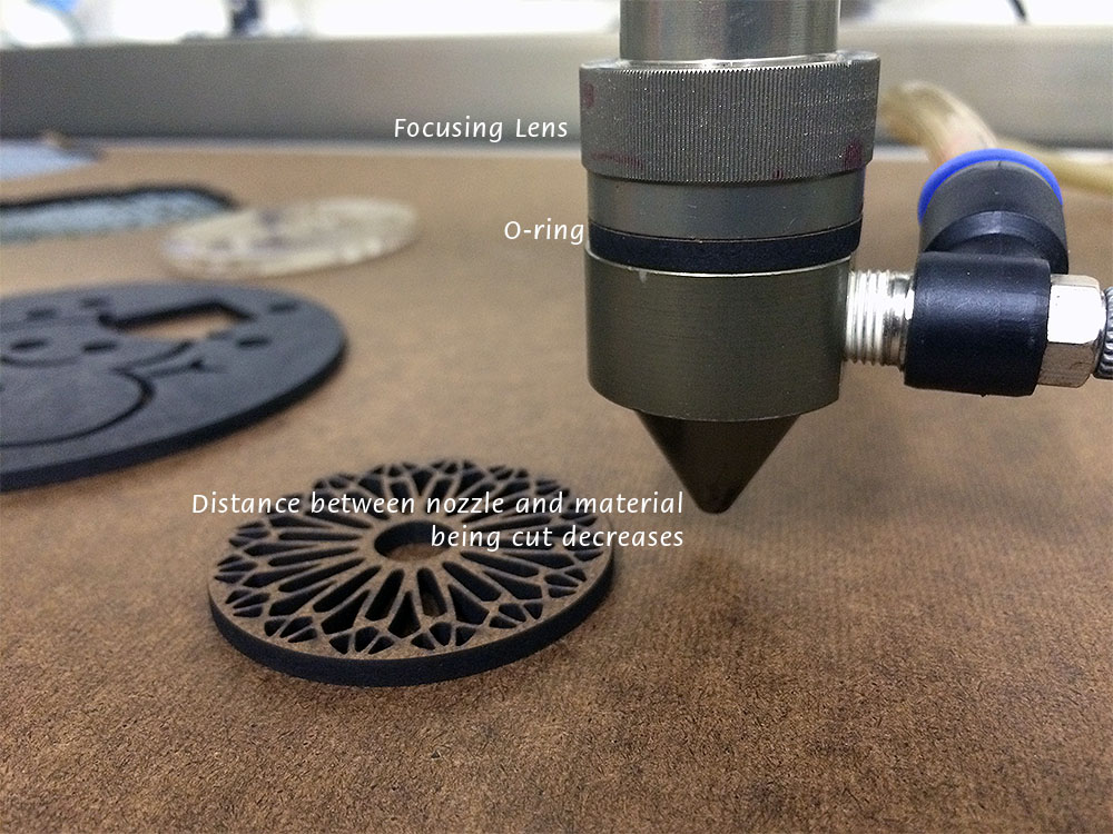 Yesterday, while cutting a unicode snowman for a software development team, I had a bit of inspiration and cut a small o-ring to act as a spacer between the focusing lens and the screw on nozzle. This shifts the nozzle down a little and puts the aperture closer to the beam waist. I would have liked to have used two spacer rings, but the threads on the nozzle are quite shallow and I was worried that it wouldn't stay on.