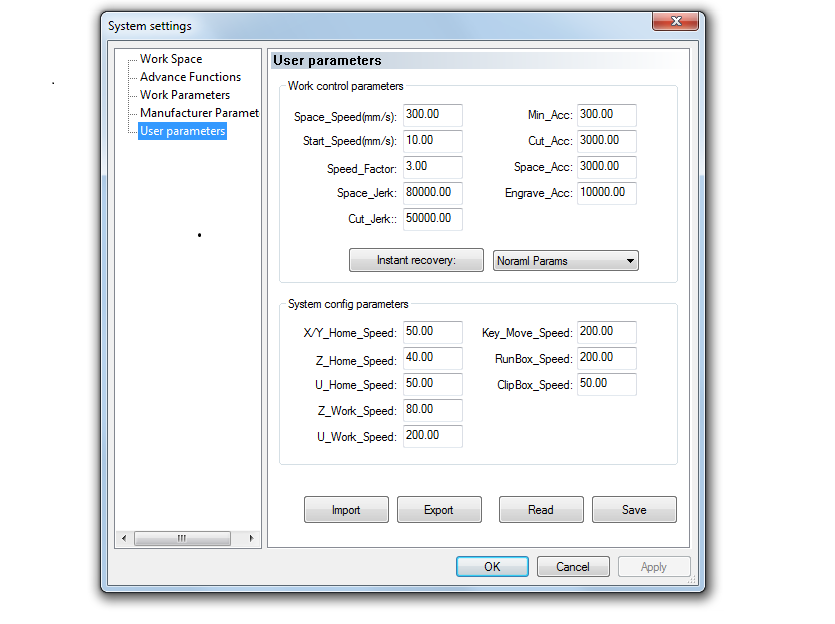 At the request of speedythinker I am attaching a screen shot of both Manufacturers Partameters and User Parameters.