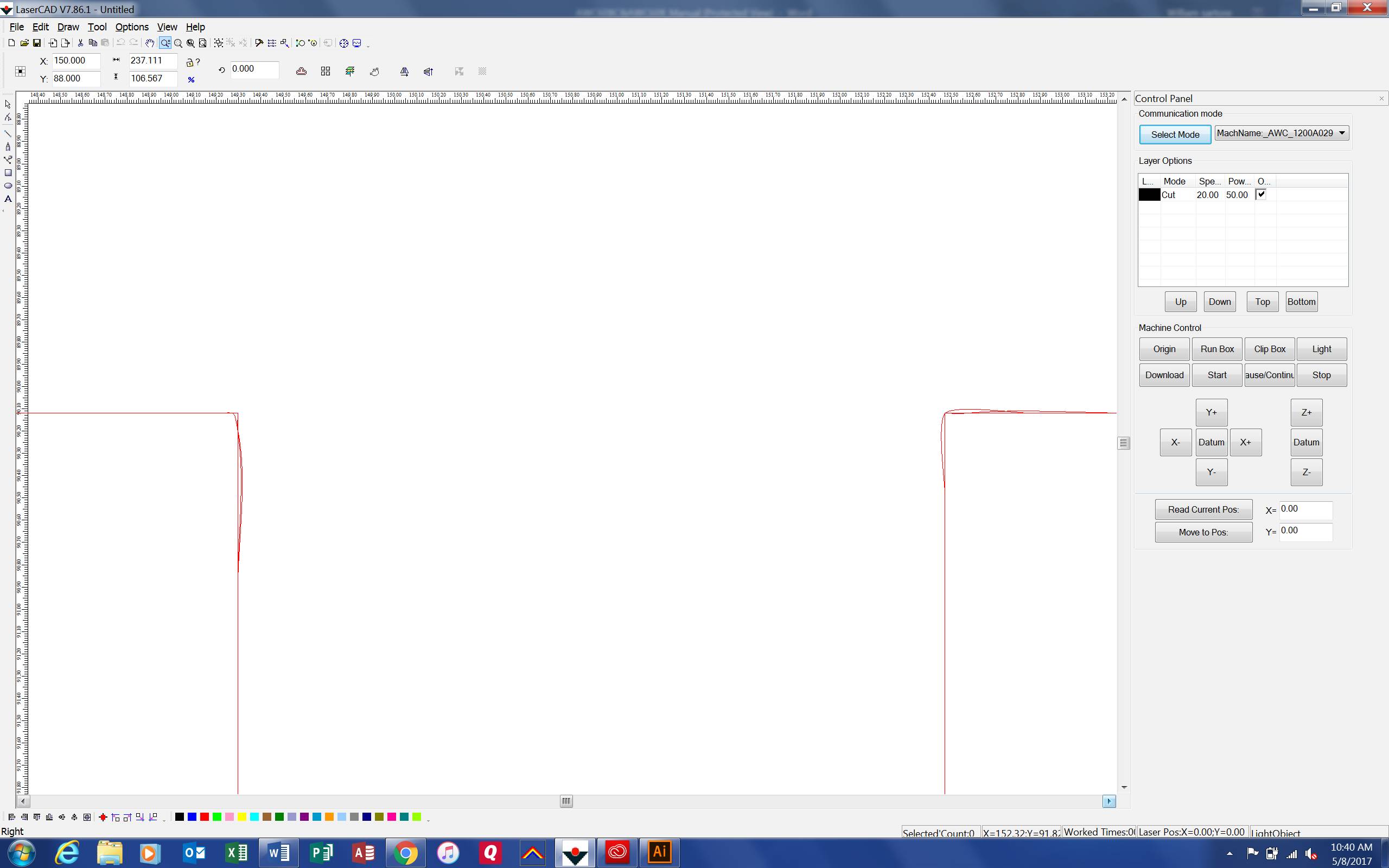 Not sure what you mean... but sometimes there are a lot of duplicated lines in a drawing. Not visible on the screen but present.MicroBill wrote:when I import it into LaserCad it took the lines from the AI drawing and made them three cutting lines wide.