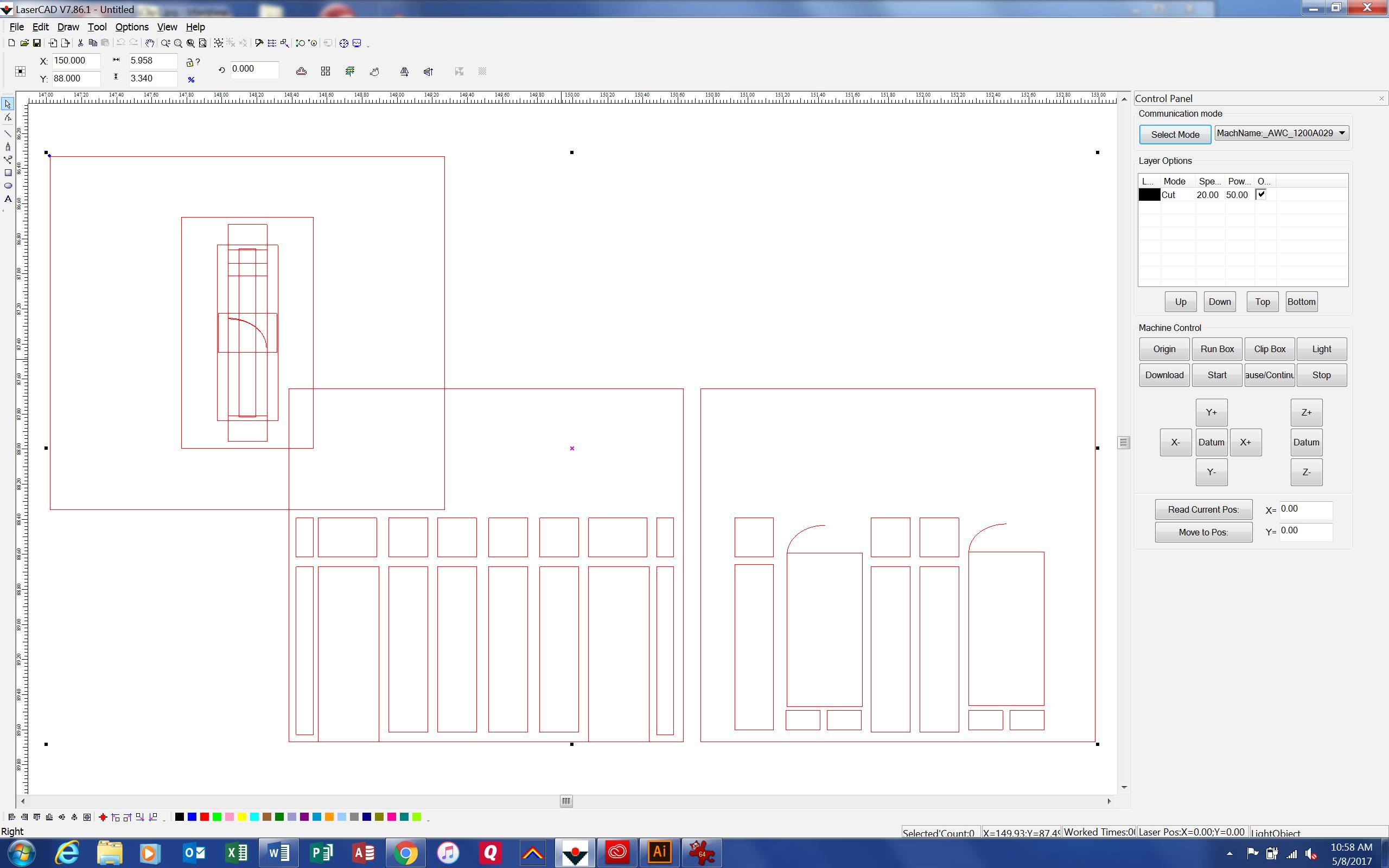 Bill I am looking at your file now.... looks like a cooking grate! Anyway are you cutting the slots first or what is the cutting order? You can set different colors to have cut at more or less power or speed... and maybe you already know that? If so I will bug off.MicroBill wrote:Well the subject line pretty much says it all. Just wondering.