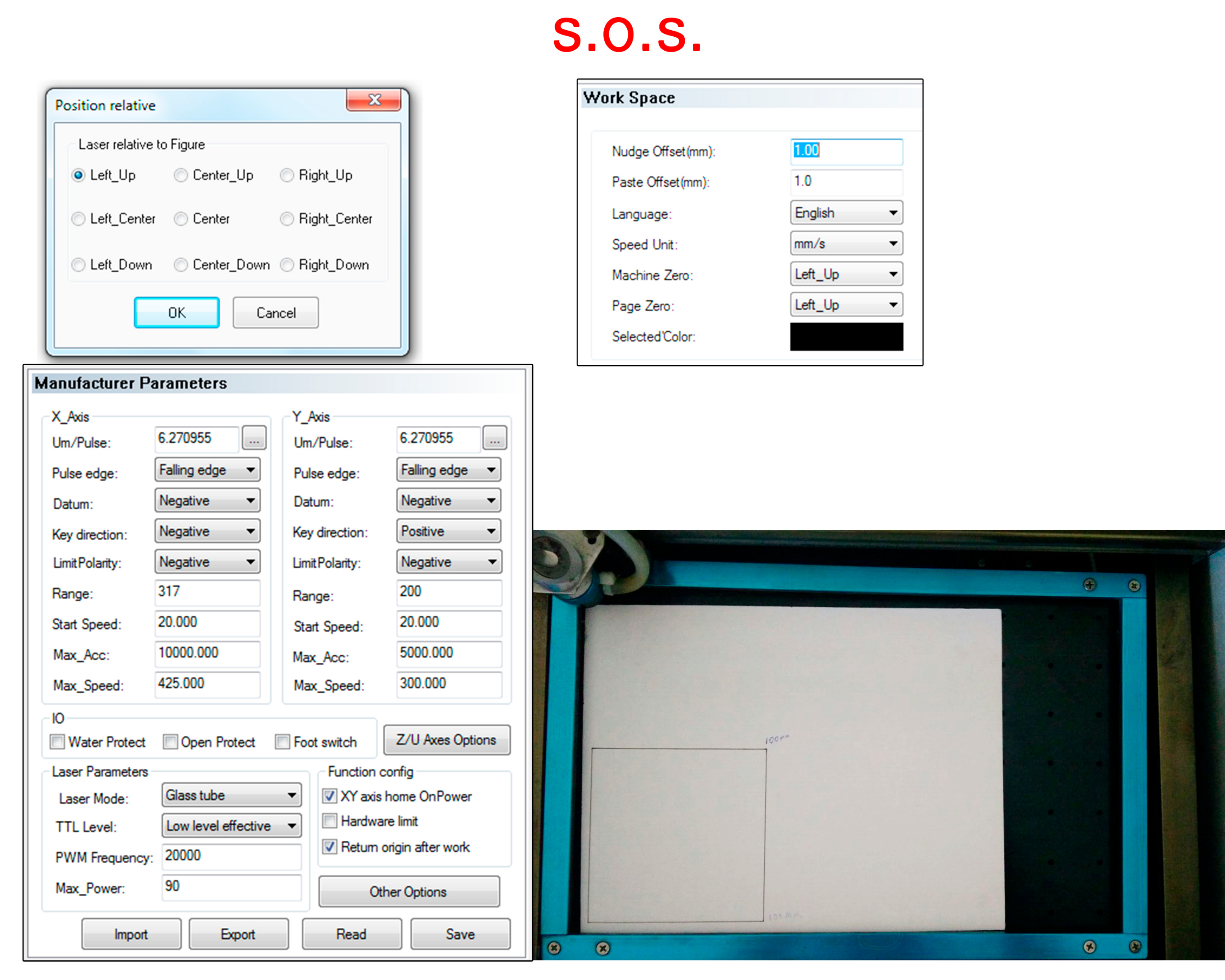 I have tried everyting, I switch negative to positive and made the 4 posible combinations with them (+ &-)in each section and nothing. the three positions are in left up. I marked x 0 y 0 as origin and the um is in perfect conditions because the 100x100 box is cutted 100x100.