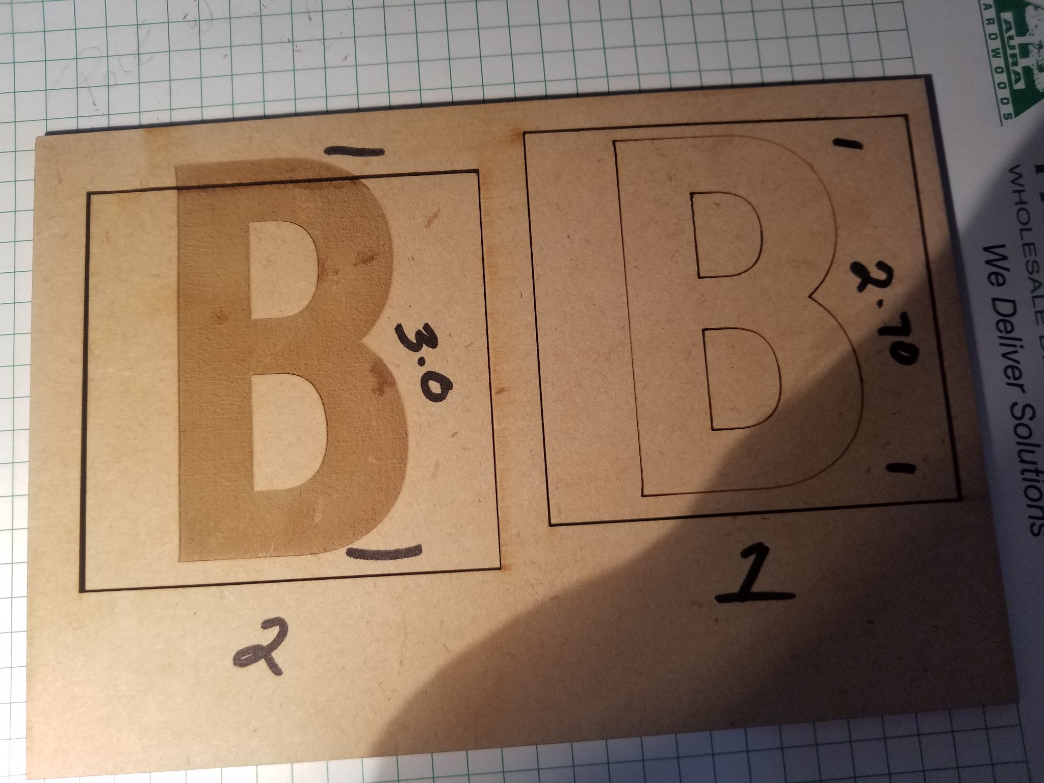 Picture #2.. First the letter ”B” is engraved. Notice the size is stretched in only the Y axis. Then the box is cut around the letter. Notice the box is shifted down also. If I cut the box first it would be lined up with box in picture #1