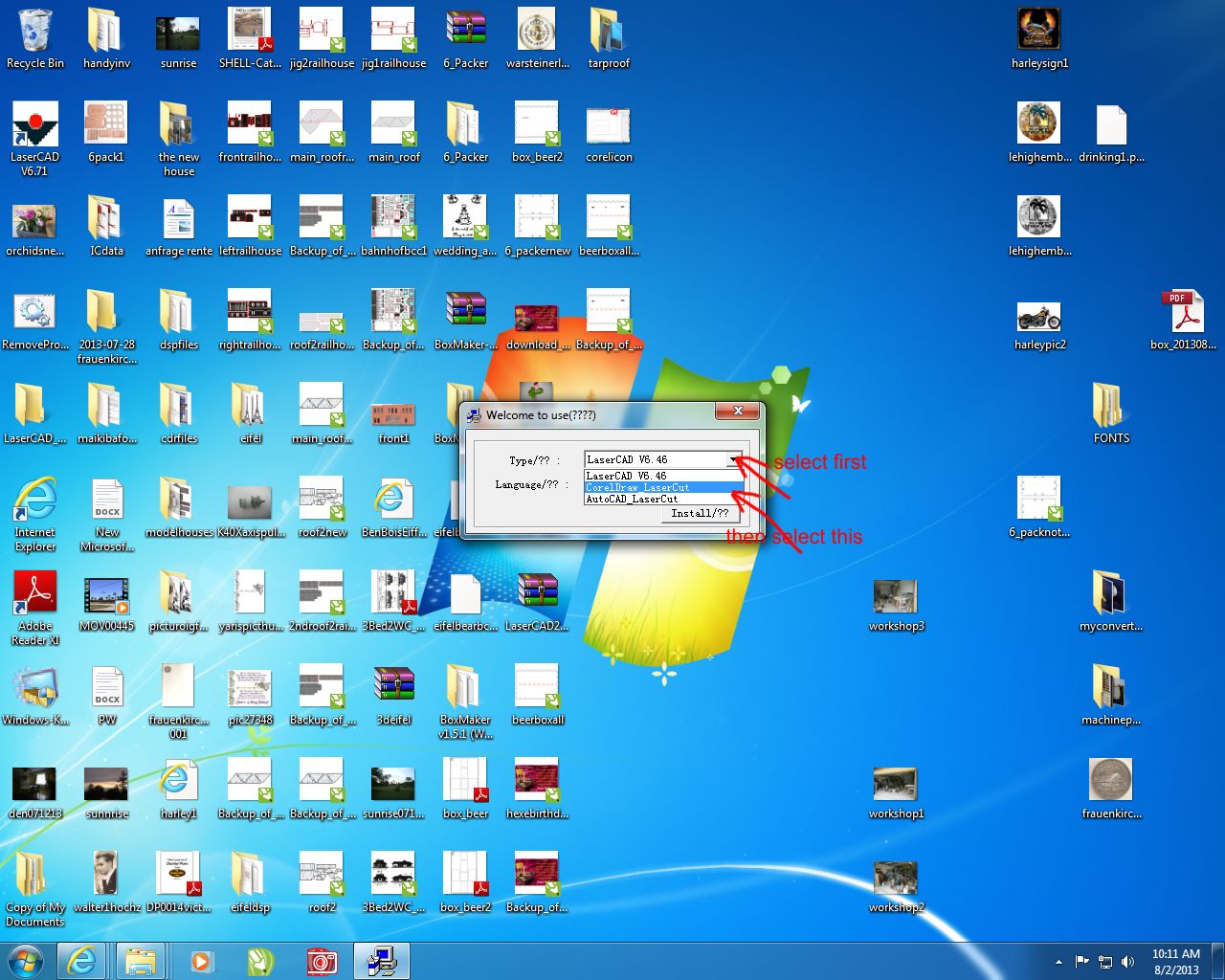 if you runn XP or windows7 then you should un-install lasercad including manually delete all lasercad files from the directory, empty the recycling basket. then shut down computer and restart then install lasercad new like shown here on the picture