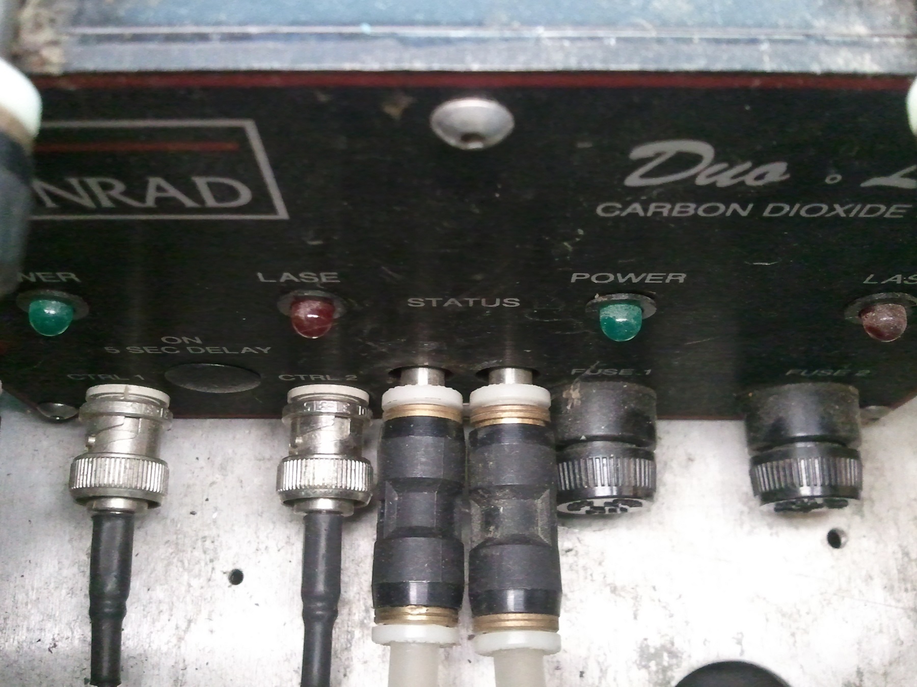 I am also not sure what I need to change, but the Z-axis cuts out when moving up if I hold the jog key for too long. Is my acceleration too high or too low? Should I change the micro-stepping setting on the controller ore will this all go away with the correct um/pulse setting (if it would work). Here is the laser power supply. It provides constant power to the laser and the BNC connectors below are what I have connected to the TTL pins at laser1 and laser2. I am hoping that both laser1 and laser2 will fire at the same time when lasing. I have the frequency at 5000 Hz for the "tickle/pre-ignition" signal required all the time while running the laser.