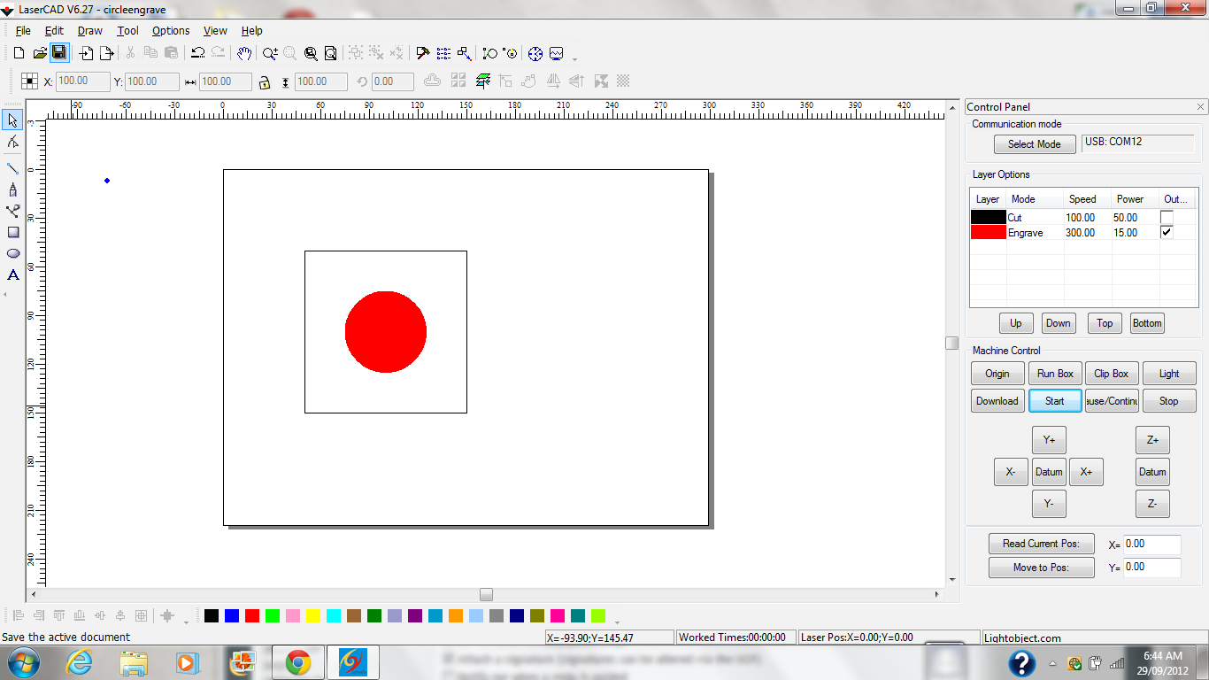 I,ve done the little exercise above. The attached files show how the job was set out but #2 file depicts how the laser printed on my work area. Seems the only way I can place an object is too draw a virtual box around the object and uncheck it in the Layer Options. Then it prints with a correct relationship to (0,0) As for this exercise the circle engraved properly and took 00.03.22 The LCD screen displayed the correct info when the job was printing