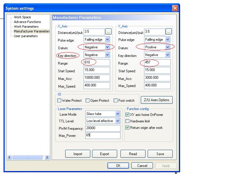 Now discounnect power to the machine and move the laser head to the center of the X-Y bed (of couse by hand). Then power it up machine and pay attention to the movement of the laser head. Assuming the Home is designated to the Bottom Right and if the machine is moveing to the other way, say "Top Left". Then, discounnectthe power to the stepping motor (not DSP). Go to System steting on the LaserCad and do some change on the Datum.