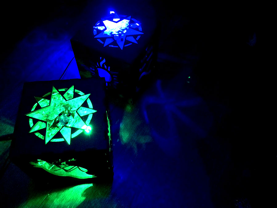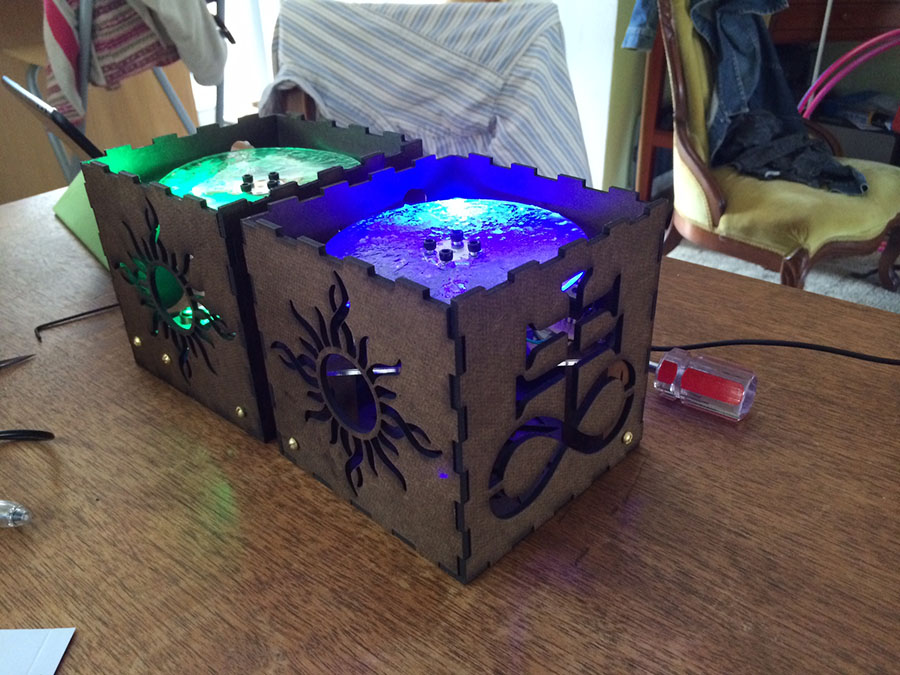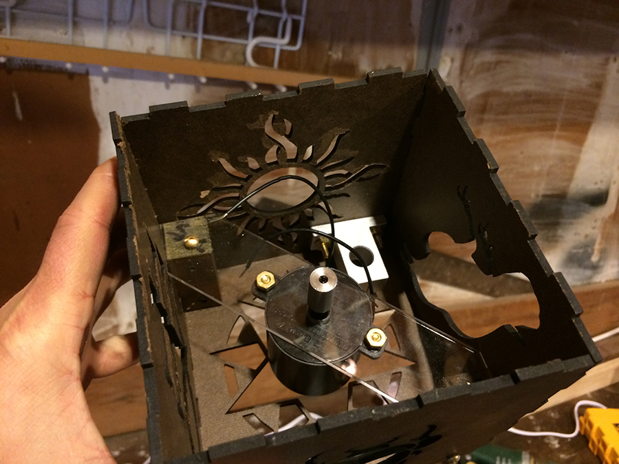 i laser cut acrylic pieces for the motor support and lumia disk: fits like a glove: the small aluminum widget in the box corner is the mount for the laser diode module. i built two motor speed control circuits (one for each box): testing the electronics: i coated the wheels with blobs of clear silicon sealant to diffract/distort the laser light and create the lumia effect. in the dark they are quite stunning. laser light that is reflected off the lumia disk projects through the cut outs. the projected pattern on the ceiling. still photos and videos really don't do it justice. and here's some video of the green box in action:
