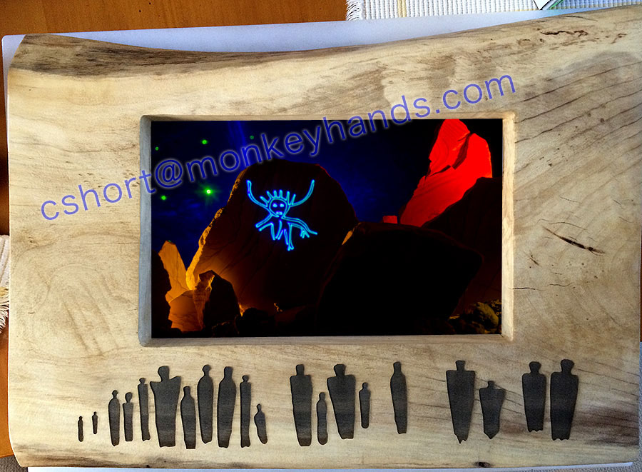 this is a handmade spalted cottonwood frame that i've laser engraved with simplified barrier canyon style petroglyphs. the image in the center is a laser projected