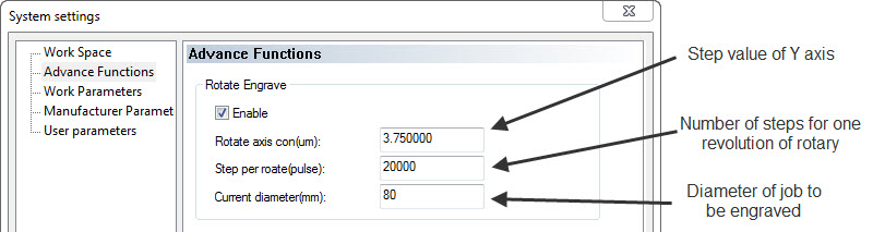 The third entry is the diameter of the job to be engraved in mm. This will need to be measured and set for every job.