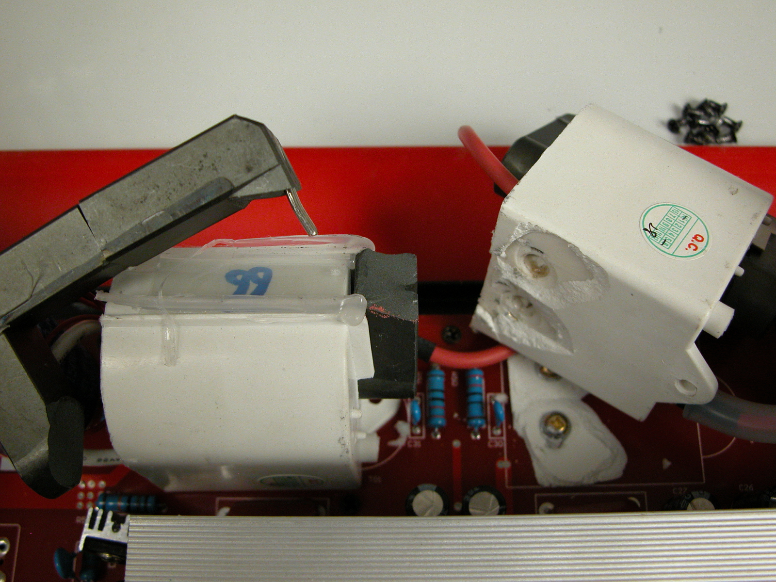I opened the cover to check the origin of the noise, and found the 2 HV coils broken! You can see the detail on the photos