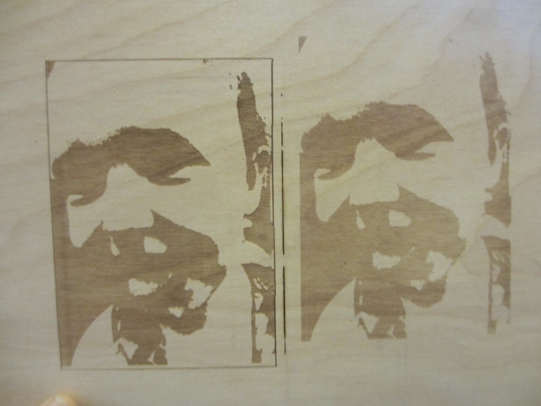 For example, even after aligning the optics, if I try to cut a square out of basic cardstock at 30 mm/s, 500 PPI, 50% power, it barely makes it through at all. If I engrave an image, even at 1000 PPI, 60% power, 200 mm/s I don't get a very dark and certainly not deep engraving. One of the pictures below shows the same image on a single-pass engraving. The left image is the 800 PPI, 60%, 200 mm/s. The image on the right is 500 PPI, 50% power, 300 mm/s.
