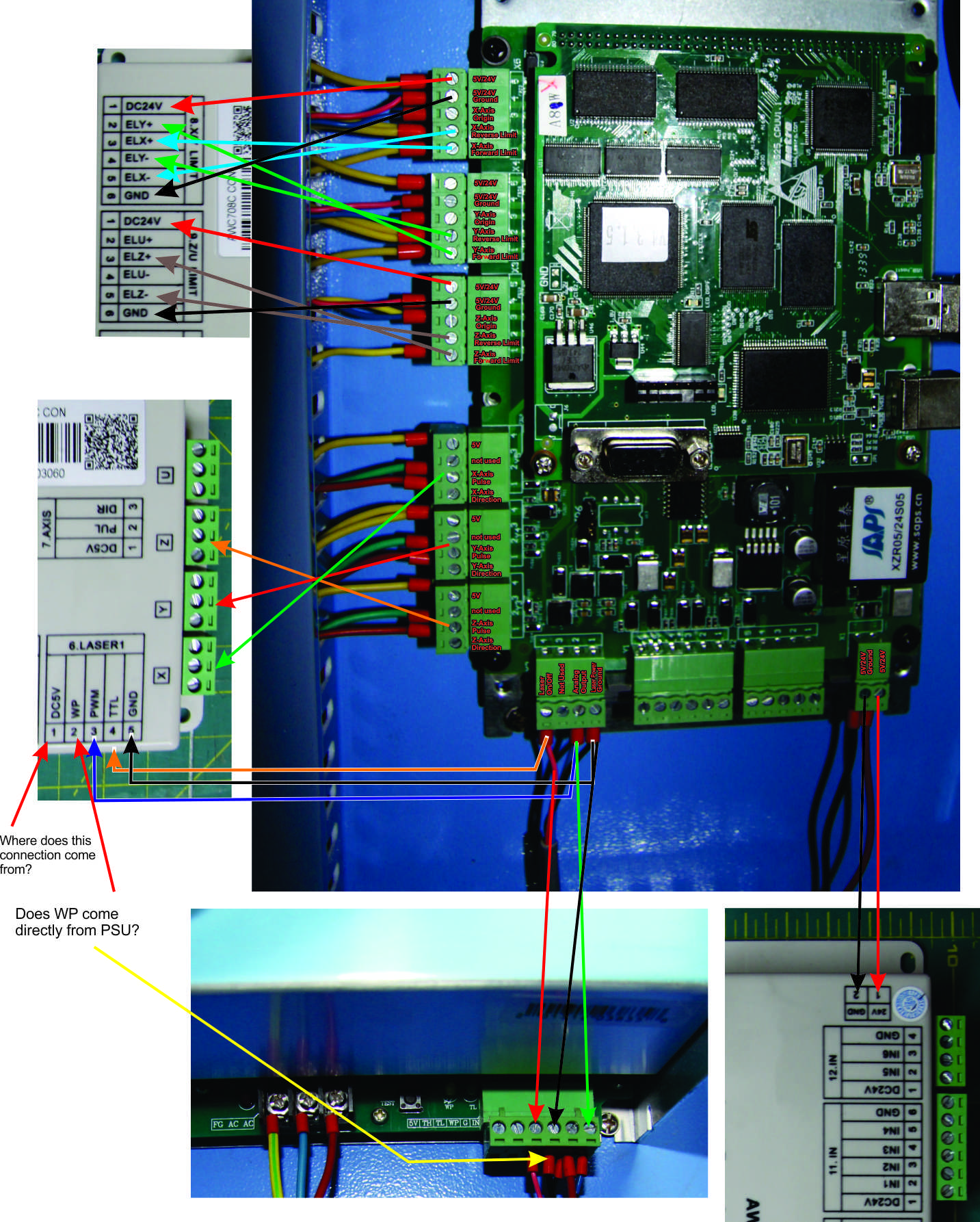 Kees or Marco - No power to panel or controller. Checked with multimeter - no power to controller - which comes directly from converter? Please see attached picture of conversion. Note on the x7 laser1 pin array I do NOT have a connection for the 5V or WP. Does this connection come directly from the PSU (not sure that is what it is called - a picture of its pin array is also included in the single pic.