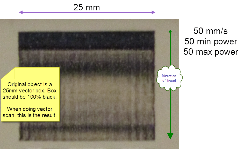 I have been fighting a problem for some time now - trying to engrave scans (bitmap or vector) caused the darker areas to be output very badly. The same solid black original would be more of a patterned set of stripes (see attached) and photos came out very blotchy. I blamed the controller