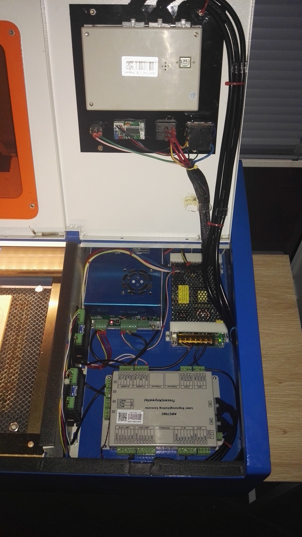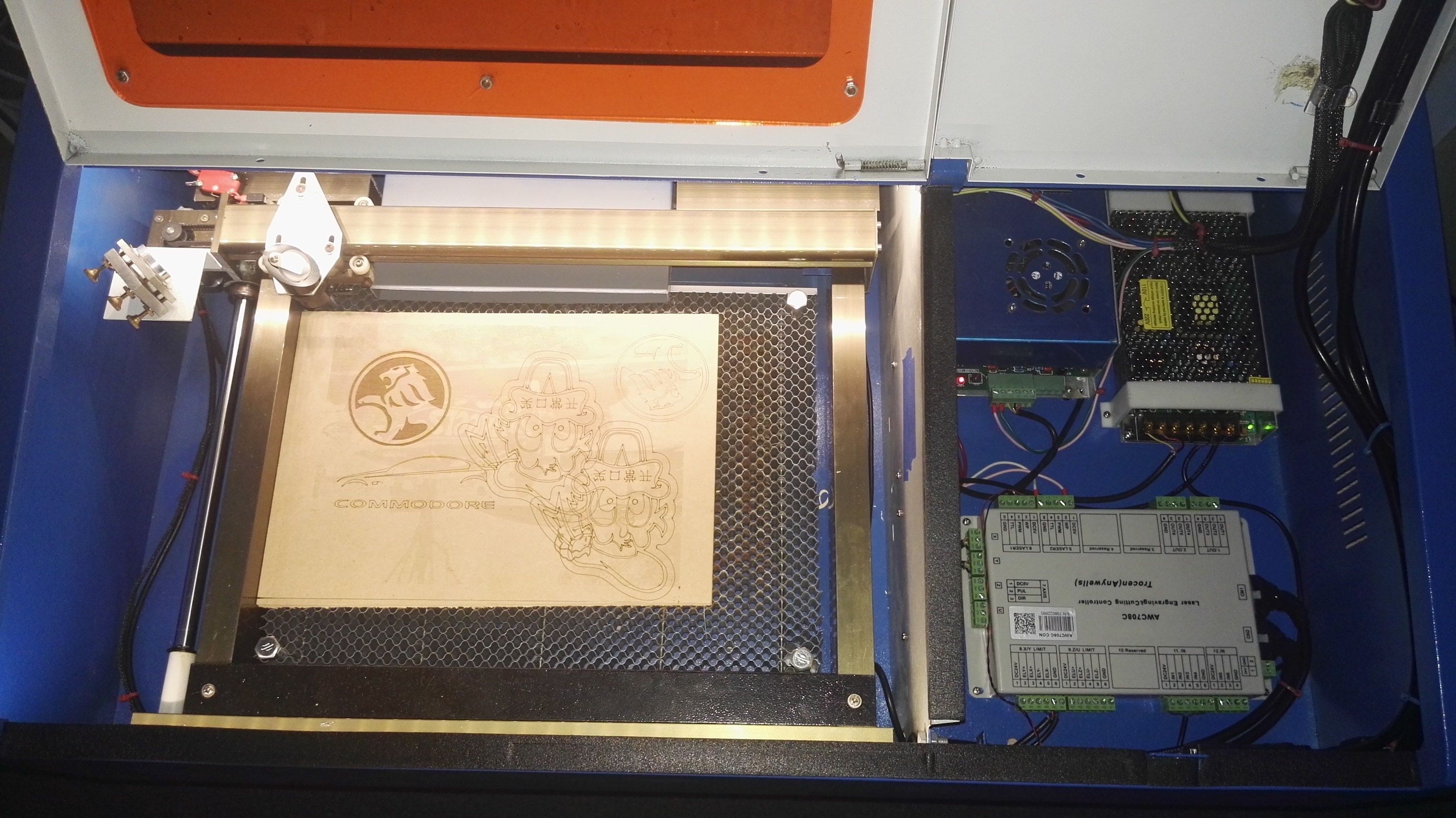 Just thought I would share my thoughts on how happy I am with the X7 DSP upgrade. It only took 2 days to complete and the wiring diagram was so easy to follow, along with the guide from Marco. Only ran in to 1 problem on completion of wiring, which was the laser wouldn't fire. After a quick 1 hour search of the forums I found someone with the exact same problem. No PWM to laser PSU and only 4.6v on the laser firing pin, simple solution ensure you plug all cables to the DSP Controller, regardless of if your only controlling 1 laser. The new system is a breeze to use utilizing Raycam, after fighting with the knockoff software that came with the laser. I now only need 1 PC for my K40 and UP Mini (Flashforge Dreamer on the way) and no dongle required. I'm still yet to hook up air assist as I need a compressor, however I have fitted the new laser head with 18mm focal lens (which further improved my cuts). I've always been able to cut 3mm Acrylic, however I'm now able to cut 6mm Acrylic on 90% at 2mm/s with 1 pass. Once I had everything up and running I added some LED lighting and toyed with the idea of WIFI. I had a TP-Link travel router lying around (I think I payed $29 AUD), so I configured it as a repeater, supplied it 5v and plugged in the Ethernet cable from the DSP. I now have WIFI and can send files to my K40 over my WIFI network with a small footprint and the cost of $29 AUD. This upgrade may seem daunting however do some reading double check wiring and ask questions and you will end up with a quite capable laser for a small price. If anyone observes any issues in the pics let me know.