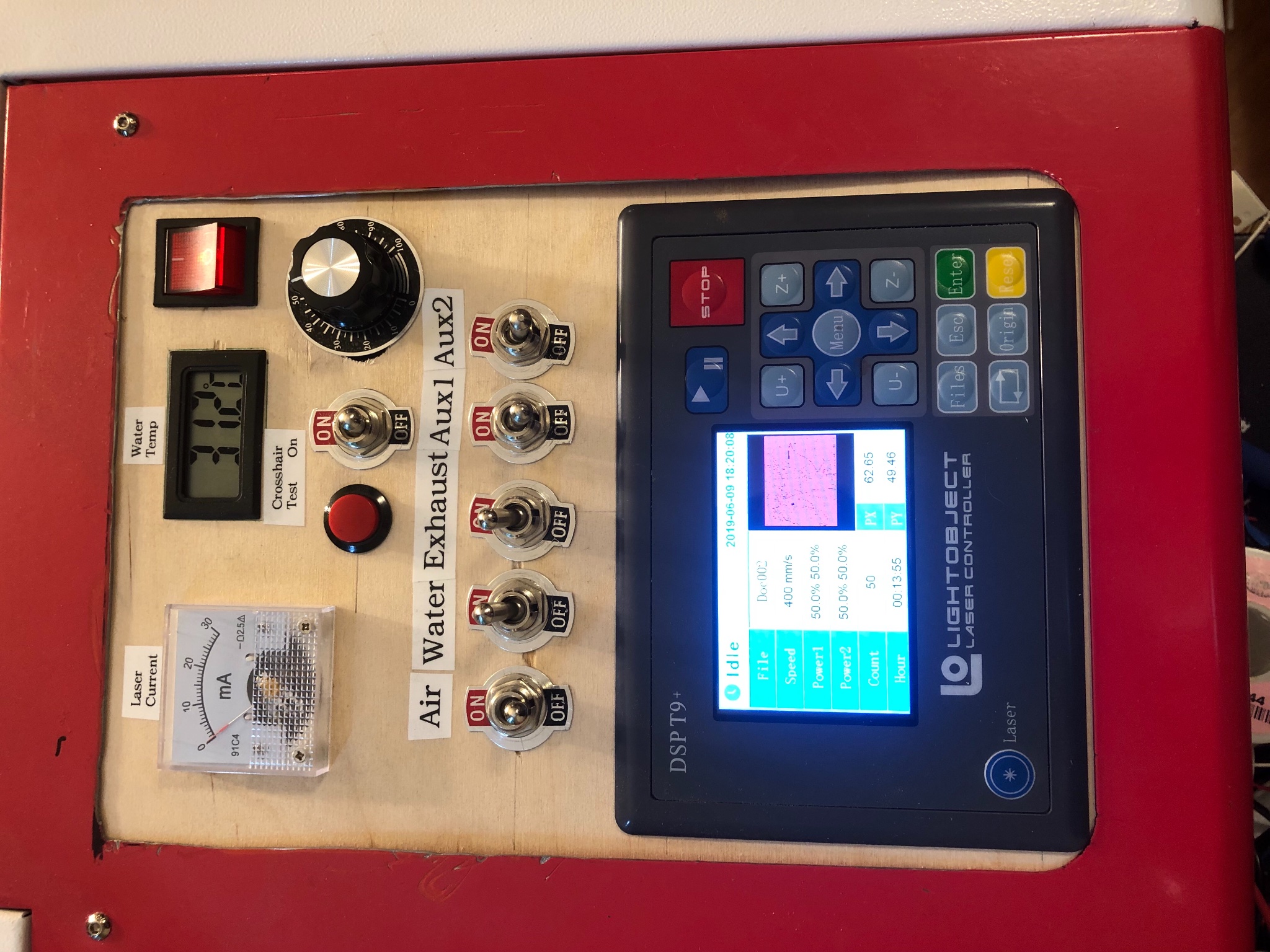 I upgraded my K40 laser with a D9+ controller, 60W power supply, new 3-prong outlets, a temp gauge, new stepper controllers, and a water pressure switch.