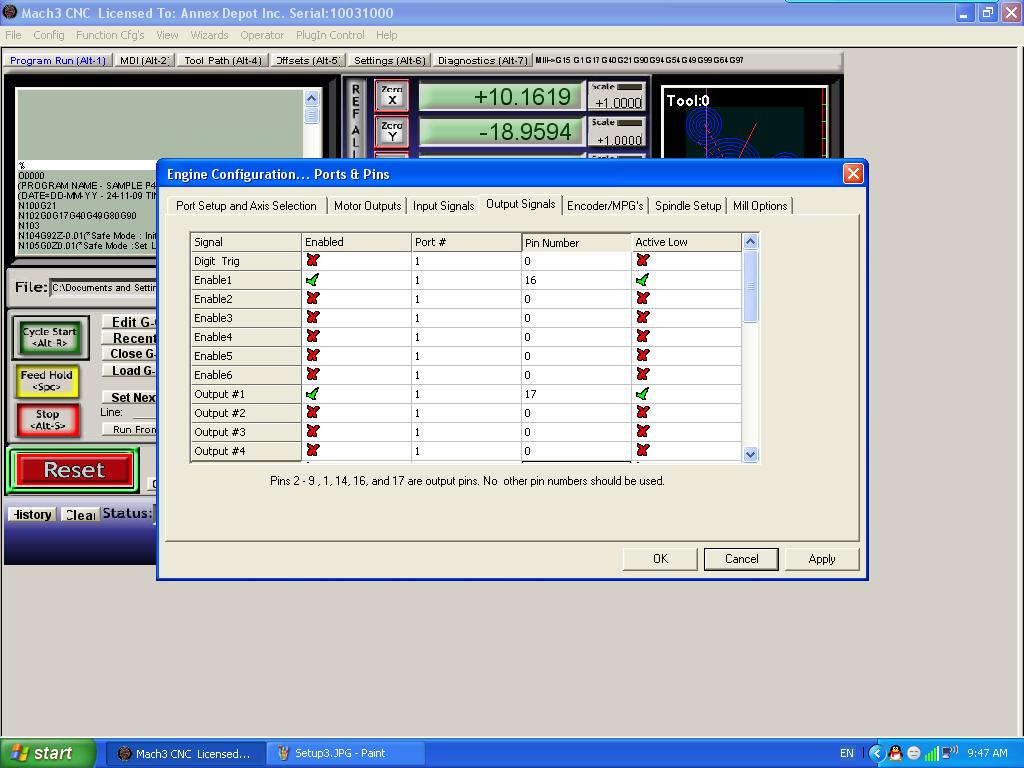 The question that needs to be answered to trigger the laser is why I should be using the relay on the board? If the Z direction changes from 5v to 0 then why can't I just drive the laser from that port directly? Why is the relay used? The circuit provided by Marco is compeletly in series. I don't see the relay changing state when the Z direction changes....it just stays on. I am pretty sure that I have configured MACH 3 as per instructions, but I may be wrong.