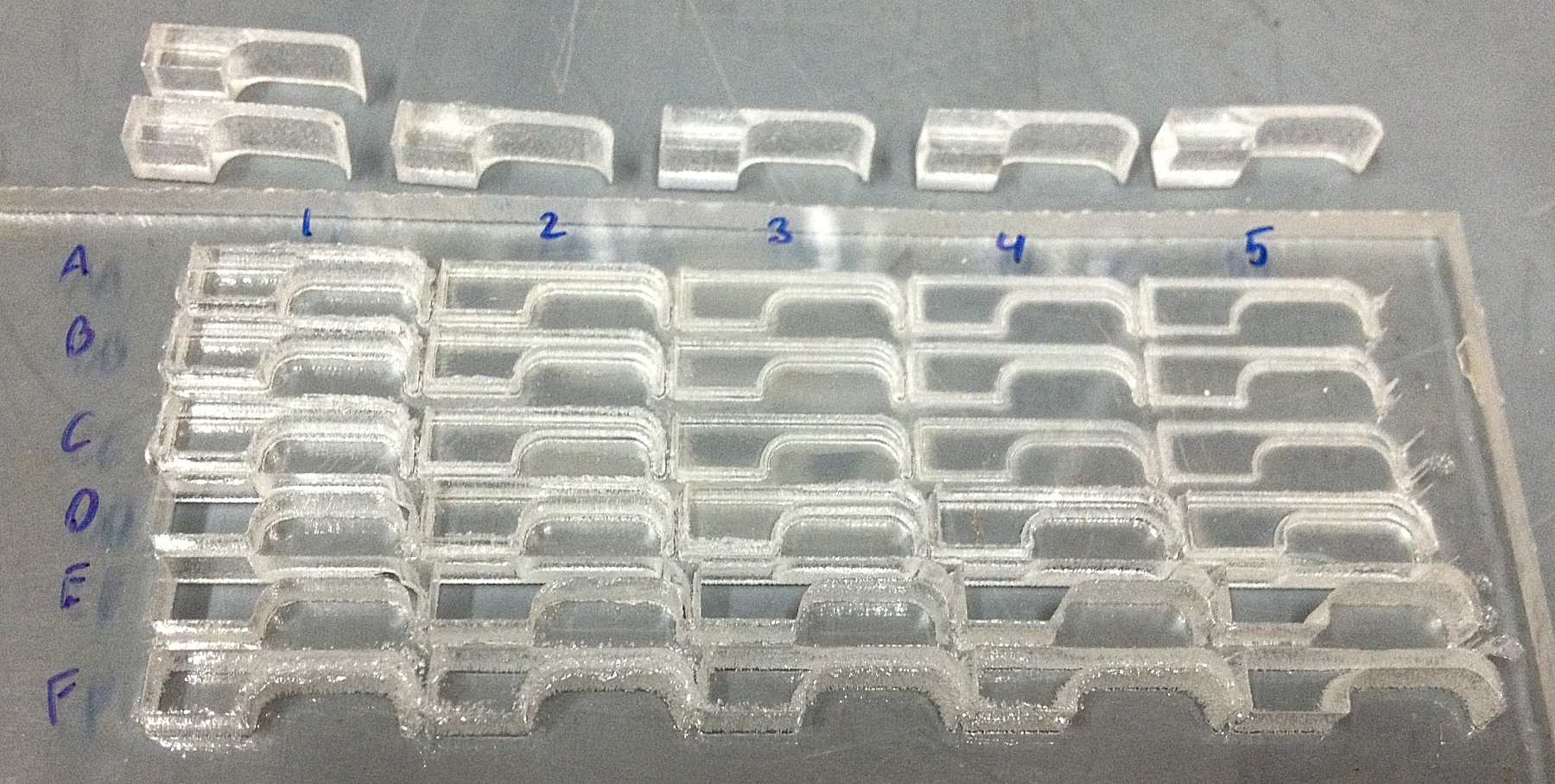 I've attached the file which corresponds to row "E" in the photo. Each part is on a different layer, each layer is set to the same power and speed (100 and 1mm). The only difference between the parts (layers) is the PPI setting. (All 5 layers cut through in 2 passes.)