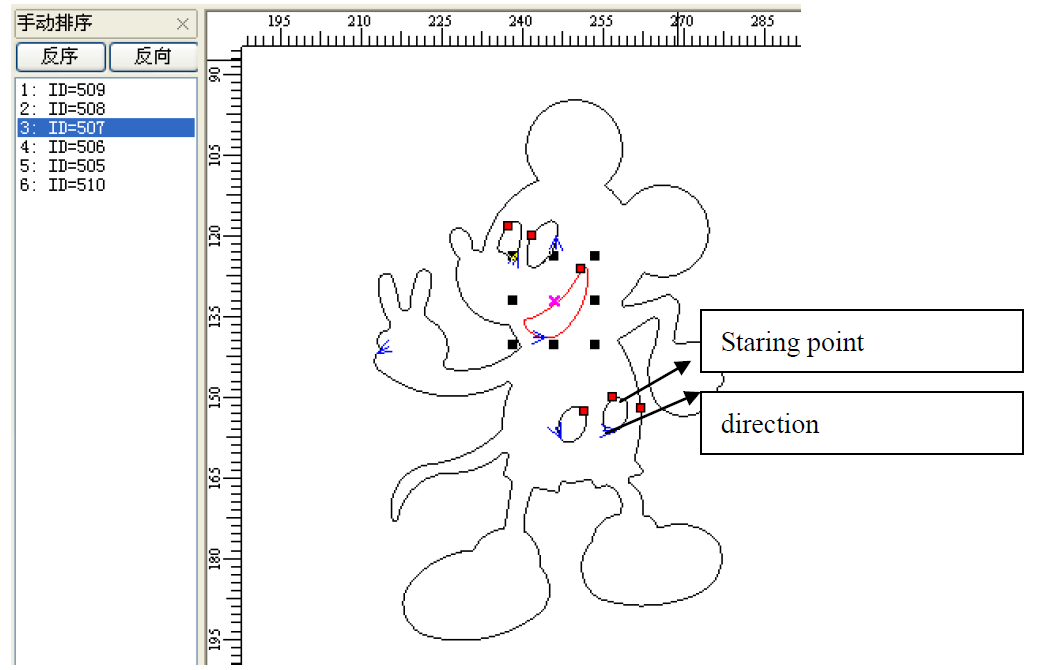 User can use [Manual Order] to set cutting serial number for each object, cutting start point and finish point.