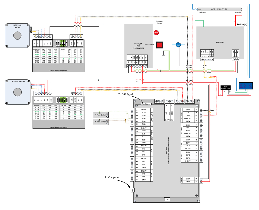 Basically you have 24v DC coming into the that small black part with the 6 pins on it. Then two wires on the output side go to the digital display, the blue and green wires from the digital display to to the laser power supply (blue wire) and the cathode (green wire).
